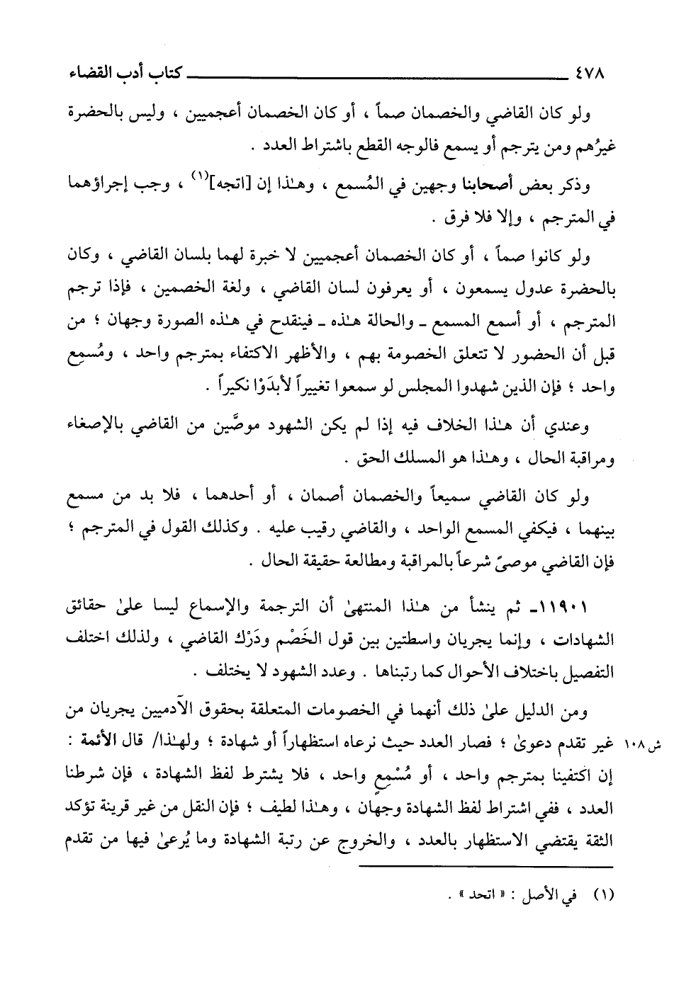 11901 - ثم ينشأ من هذا المنتهى أن الترجمة والإسماع ليسا على حقائق الشهادات، وإنما يجريان واسطتين بين قول الخَصْم ودَرْك القاضي، ولذلك اختلف التفصيل باختلاف الأحوال كما رتبناها. وعدد الشهود لا يختلف.