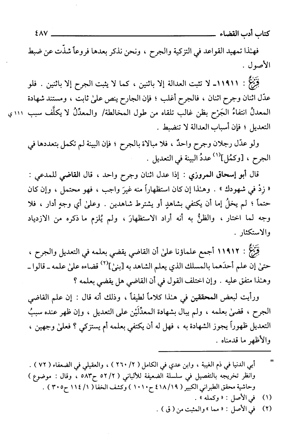 11911 - لا تثبت العدالة إلا باثنين، كما لا يثبت الجرح إلا باثنين. فلو عدّل اثنان وجرح اثنان، فالجرح أغلب؛ فإن الجارح ينص على ثابت، ومستند شهادة المعدلِّ انتفاءُ الجَرْح بظن غالب تلقاه من طول المخالطة والمعدِّلُ لا يكلَّف سبب التعديل؛ فإن أسباب العدالة لا تنضبط.