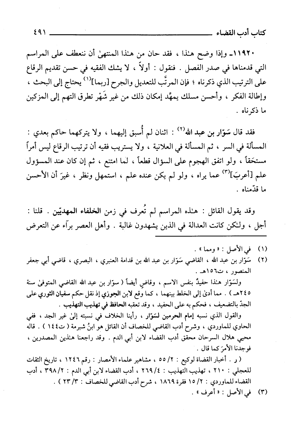 والقول الذي نسبه إمام الحرمين لسَوّار، رأينا الخلات في نسبته إلى غير الجد، ففي الحاوي للماوردي، وشرح أدب القاضي للخصاف أن القائل هو ابنُ شبرمة (ت 144). قاله محيي هلال السرحان محقق أدب القضاء لابن أبي الدم. وقد راجعنا هذين المصدرين، فوجدنا الأمرَ كما قال.