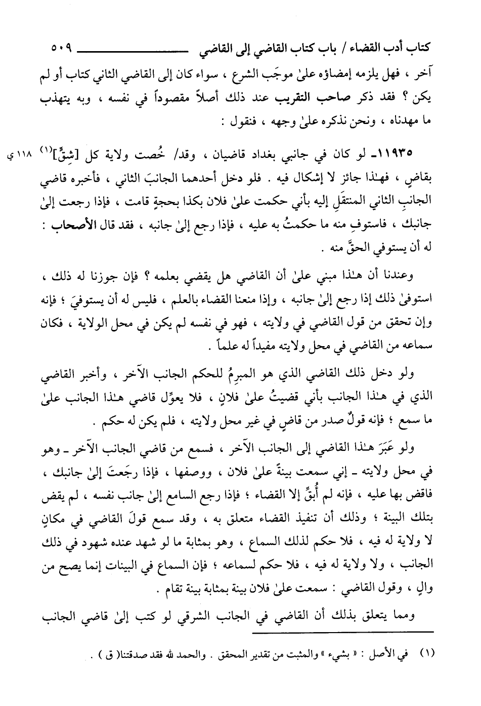 11935 - لو كان في جانبي بغداد قاضيان، وقد خُصت ولاية كل [شِقٍّ] (1) بقاضٍ، فهذا جائز لا إشكال فيه. فلو دخل أحدهما الجانبَ الثاني، فأخبره قاضي الجانبِ الثاني المنتقَلِ إليه بأني حكمت على فلان بكذا بحجةٍ قامت، فإذا رجعت إلى جانبك، فاستوفِ منه ما حكمتُ به عليه، فإذا رجع إلى جانبه، فقد قال الأصحاب: له أن يستوفي الحقَّ منه.