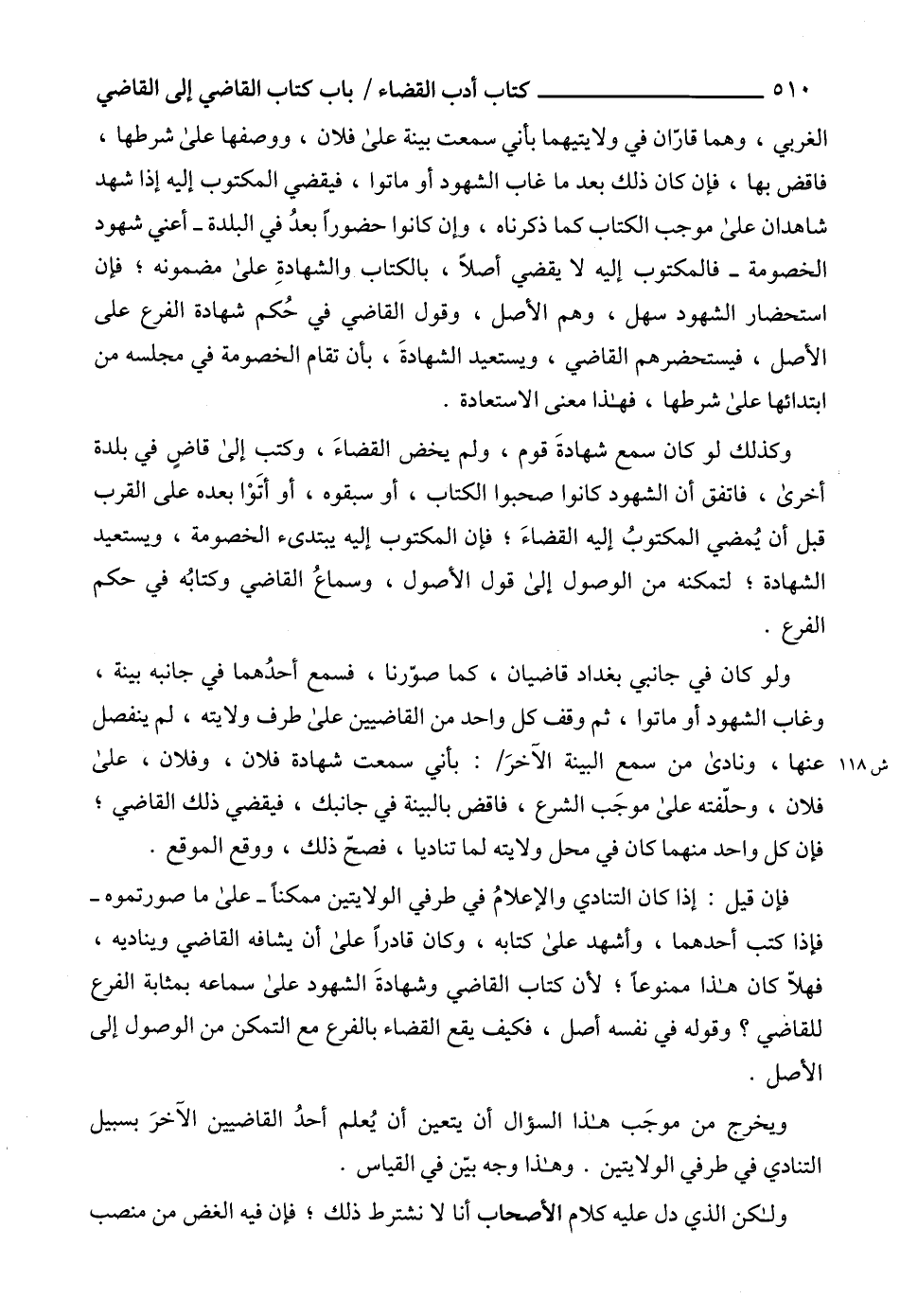 ويخرج من موجَب هذا السؤال أن يتعين أن يُعلم أحدُ القاضيين الآخرَ بسبيل التنادي في طرفي الولايتين. وهذا وجه بيّن في القياس.