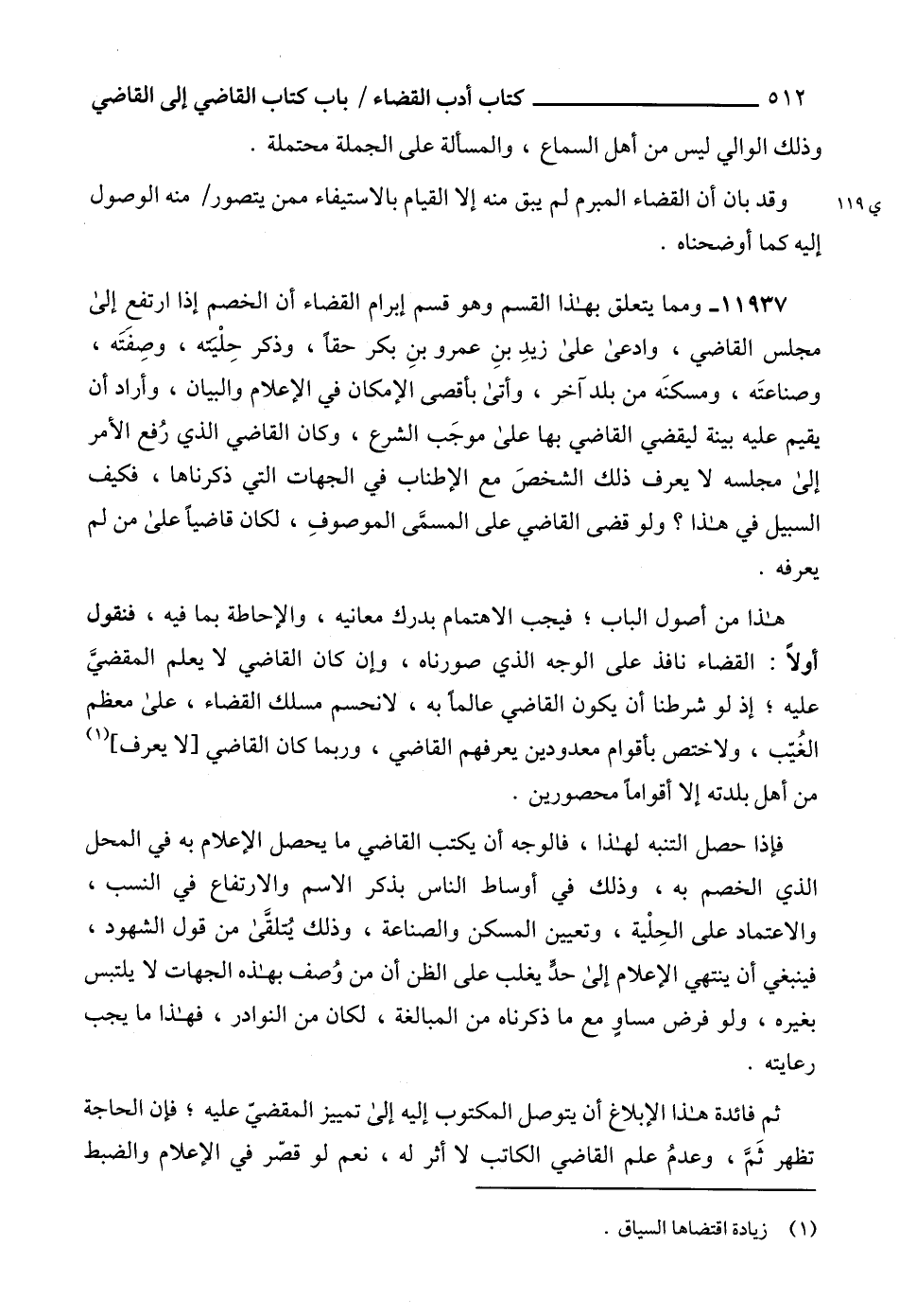 11937 - ومما يتعلق بهذا القسم وهو قسم إبرام القضاء أن الخصم إذا ارتفع إلى مجلس القاضي، وادعى على زيدِ بنِ عمرو بنِ بكر حقاً، وذكر حِلْيَته، وصِفَتَه، وصناعتَه، ومسكنَه من بلد آخر، وأتى باقصى الإمكان في الإعلام والبيان، وأراد أن يقيم عليه بينة ليقضي القاضي بها على موجَب الشرع، وكان القاضي الذي رُفع الأمر إلى مجلسه لا يعرف ذلك الشخصَ مع الإطناب في الجهات التي ذكرناها، فكيف السبيل في هذا؟ ولو قضى القاضي على المسمَّى الموصوفِ، لكان قاضياً على من لم يعرفه.
