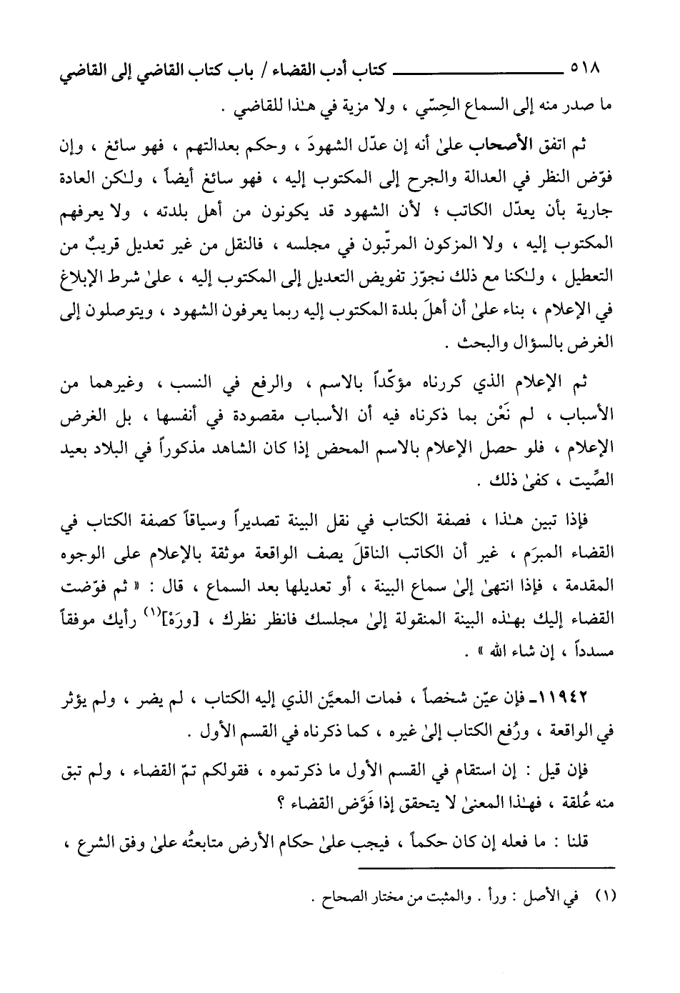 فإذا تبين هذا، فصفة الكتاب في نقل البينة تصديراً وسياقاً كصفة الكتاب في القضاء المبرَم، غير أن الكاتب الناقلَ يصف الواقعة موثقة بالإعلام على الوجوه المقدمة، فإذا انتهى إلى سماع البينة، أو تعديلها بعد السماع، قال: " ثم فوّضت القضاء إليك بهذه البينة المنقولة إلى مجلسك فانظر نظرك، [ورَهْ] (1) رأيك موفقاً مسدداً، إن شاء الله ".