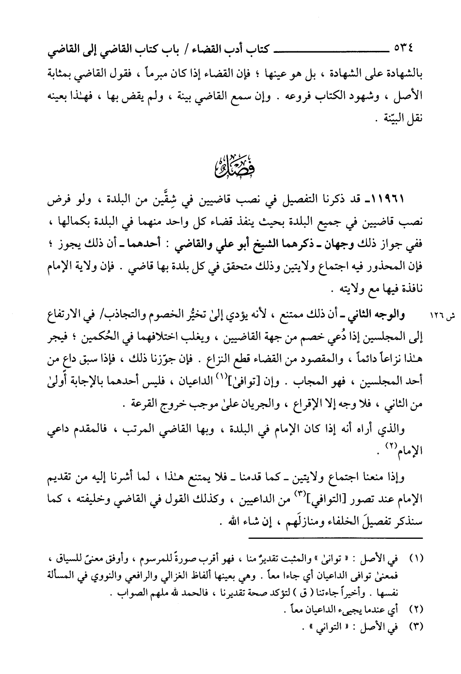 11961 - قد ذكرنا التفصيل في نصب قاضيين في شِقَّين من البلدة، ولو فرض نصب قاضيين في جميع البلدة بحيث ينفذ قضاء كل واحد منهما في البلدة بكمالها، ففي جواز ذلك وجهان - ذكرهما الشيخ أبو علي والقاضي: أحدهما - أن ذلك يجوز؛ فإن المحذور فيه اجتماع ولايتين وذلك متحقق في كل بلدة بها قاضي. فإن ولاية الإمام نافذة فيها مع ولايته.