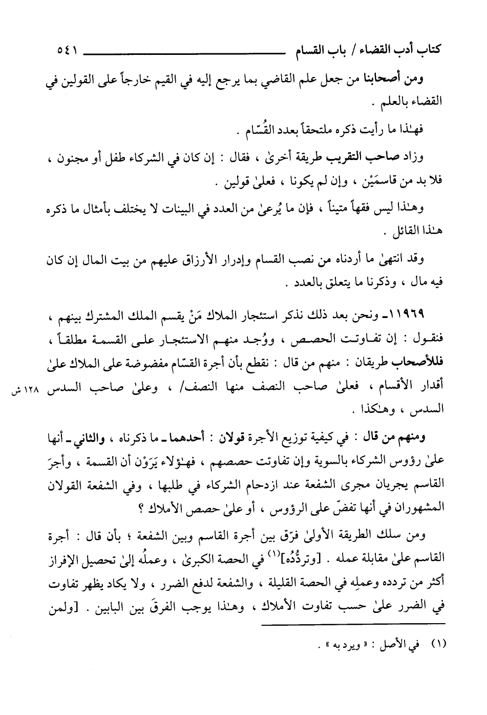 11969 - ونحن بعد ذلك نذكر استئجار الملاك مَنْ يقسم الملك المشترك بينهم، فنقول: إن تفاوتت الحصص، ووُجد منهم الاستئجار على القسمة مطلقاً، فللأصحاب طريقان: منهم من قال: نقطع بأن أجرة القسّام مفضوضة على الملاك على أقدار الأقسام، فعلى صاحب النصف منها النصف، وعلى صاحب السدس السدس، وهكذا.