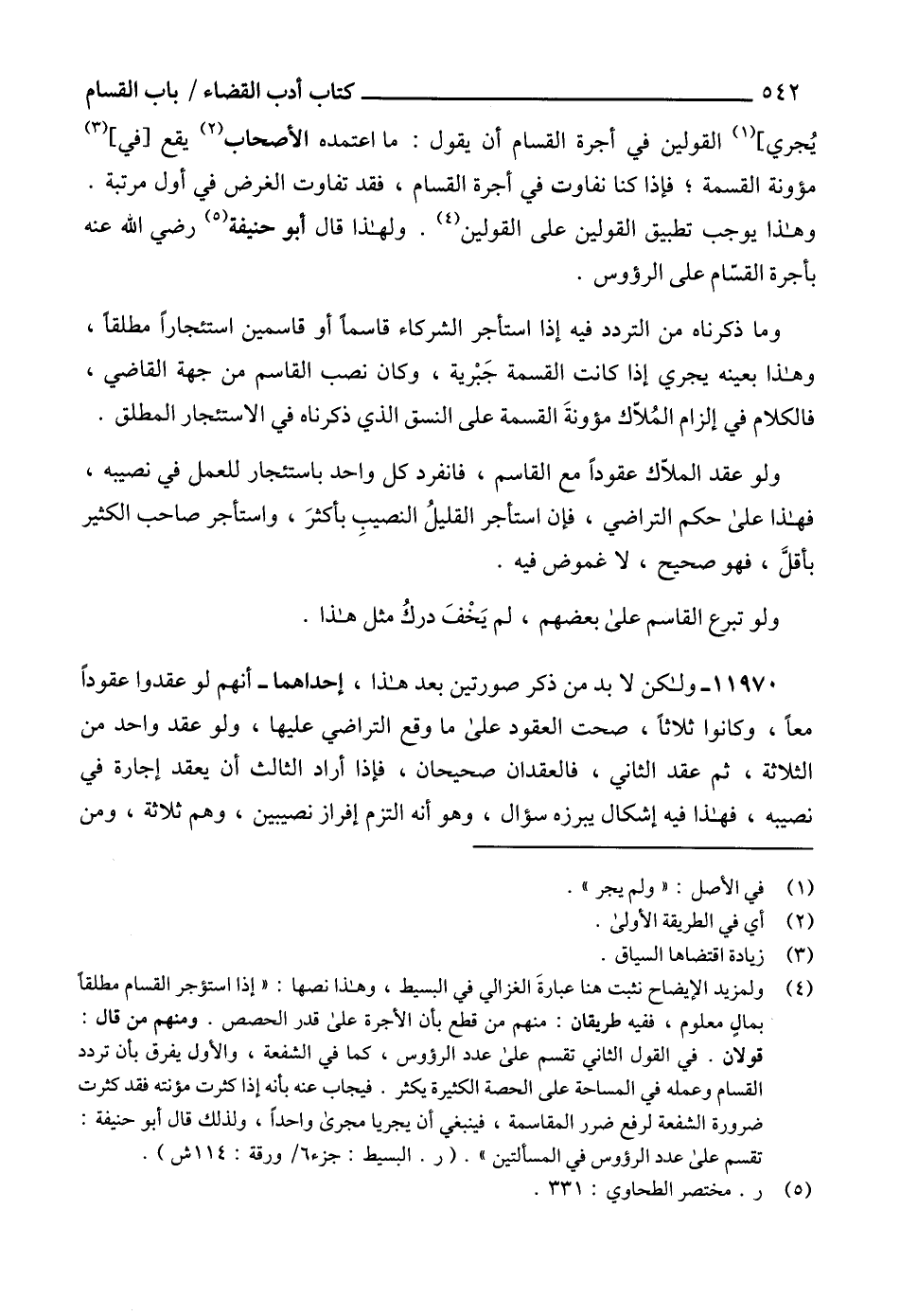 (4) ولمزيد الإيضاح نثبت هنا عبارةَ الغزالي في البسيط، وهذا نصها: "إذا استؤجر القسام مطلقاً بمالٍ معلوم، ففيه طريقان: منهم من قطع بأن الأجرة على قدر الحصص. ومنهم من قال: قولان. في القول الثاني تقسم على عدد الرؤوس، كما في الشفعة، والأول يفرق بأن تردد القسام وعمله في المساحة على الحصة الكثيرة يكثر. فيجاب عنه بأنه إذا كثرت مؤنته فقد كثرت ضرورة الشفعة لرفع ضرر المقاسمة، فينبغي أن يجريا مجرى واحداً، ولذلك قال أبو حنيفة: تقسم على عدد الرؤوس في المسألتين" (ر. البسيط: جزء 6/ورقة: 114 ش).
