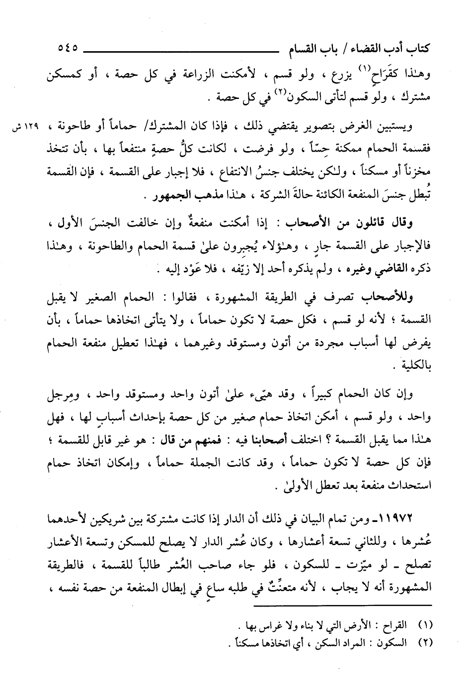 11972 - ومن تمام البيان في ذلك أن الدار إذا كانت مشتركة بين شريكين لأحدهما عُشرها، وللثاني تسعة أعشارها، وكان عُشر الدار لا يصلح للمسكن وتسعة الأعشار تصلح -لو ميّزت- للسكون، فلو جاء صاحب العُشر طالباً للقسمة، فالطريقة المشهورة أنه لا يجاب، لأنه متعنِّتٌ في طلبه ساعٍ في إبطال المنفعة من حصة نفسه،