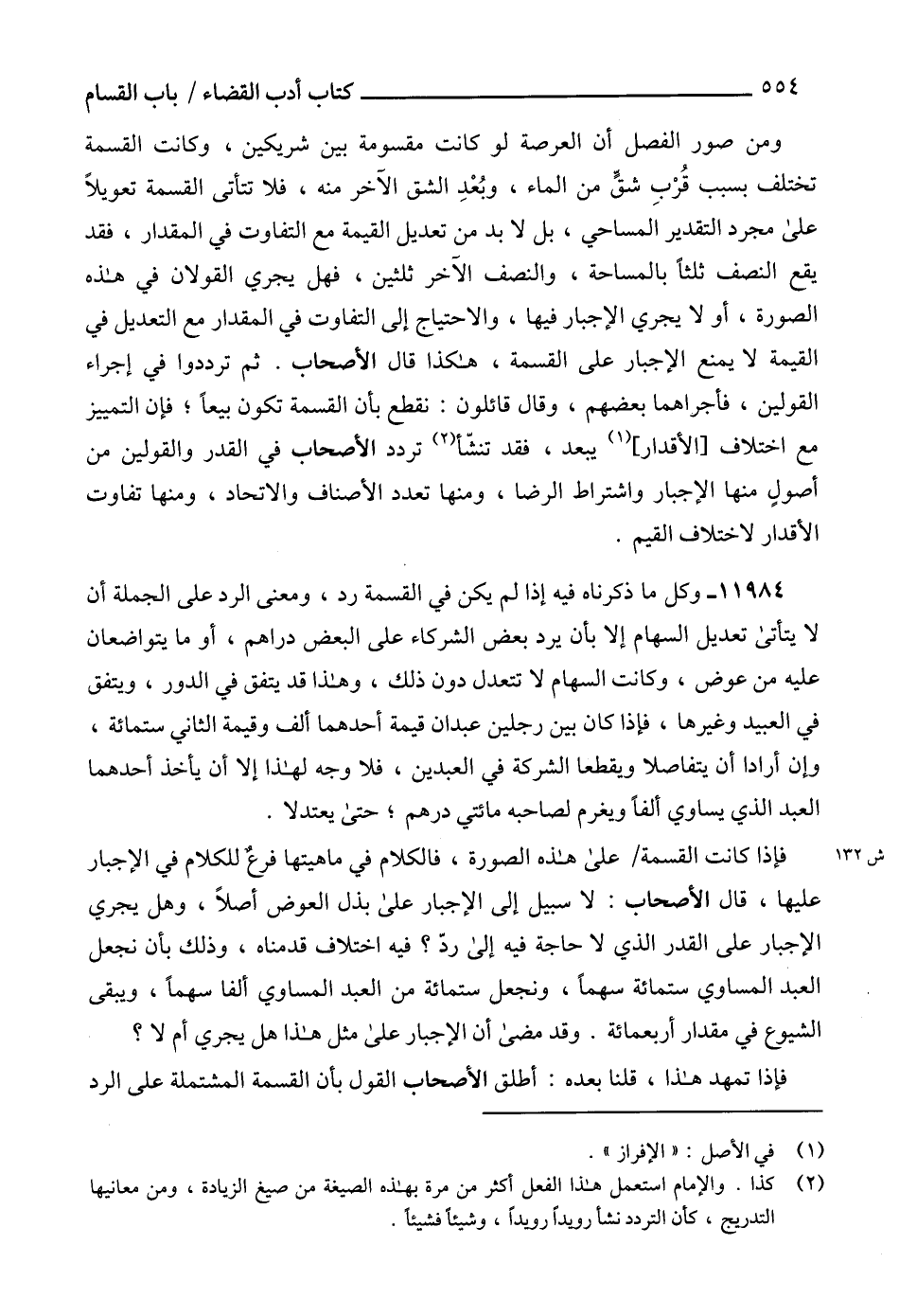11984 - وكل ما ذكرناه فيه إذا لم يكن في القسمة رد، ومعنى الرد على الجملة أن لا يتأتى تعديل السهام إلا بأن يرد بعض الشركاء على البعض دراهم، أو ما يتواضعان عليه من عوض، وكانت السهام لا تتعدل دون ذلك، وهذا قد يتفق في الدور، ويتفق في العبيد وغيرها، فإذا كان بين رجلين عبدان قيمة أحدهما ألف وقيمة الثاني ستمائة، وإن أرادا أن يتفاصلا ويقطعا الشركة في العبدين، فلا وجه لهذا إلا أن يأخذ أحدهما العبد الذي يساوي ألفاً ويغرم لصاحبه مائتي درهم؛ حتى يعتدلا.
