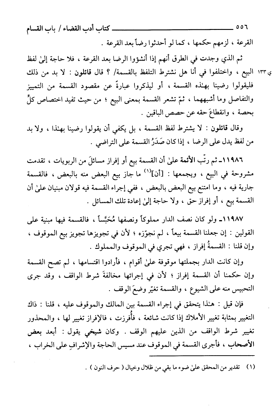 11986 - ثم رتّب الأئمة على أن القسمة بيع أو إفراز مسائلَ من الربويات، تقدمت مشروحة في البيع، ويجمعها: [أن] (1) ما جاز بيع البعض منه بالبعض، فالقسمة جارية فيه، وما امتنع بيع البعض بالبعض، ففي إجراء القسمة فيه قولان مبنيان على أن القسمة بيع، أو إفراز حق، ولا حاجة إلى إعادة تلك المسائل.