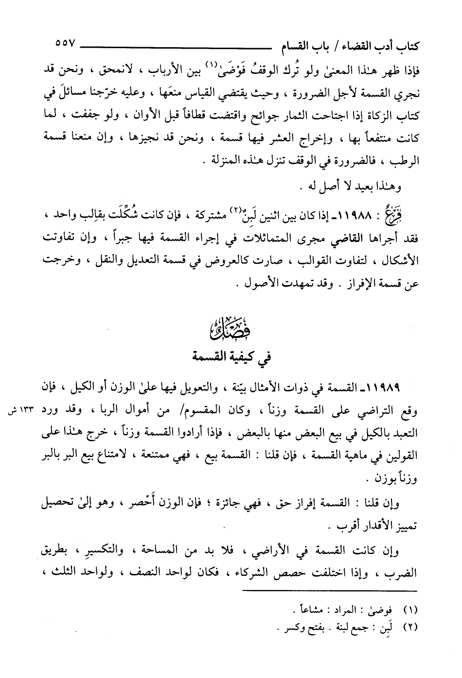 11988 - إذا كان بين اثنين لَبِنٌ (2) مشتركة، فإن كانت شُكِّلَت بقاِلب واحد، فقد أجراها القاضي مجرى المتماثلات في إجراء القسمة فيها جبراً، وإن تفاوتت الأشكال، لتفاوت القوالب، صارت كالعروض في قسمة التعديل والنقل، وخرجت عن قسمة الإفراز. وقد تمهدت الأصول.