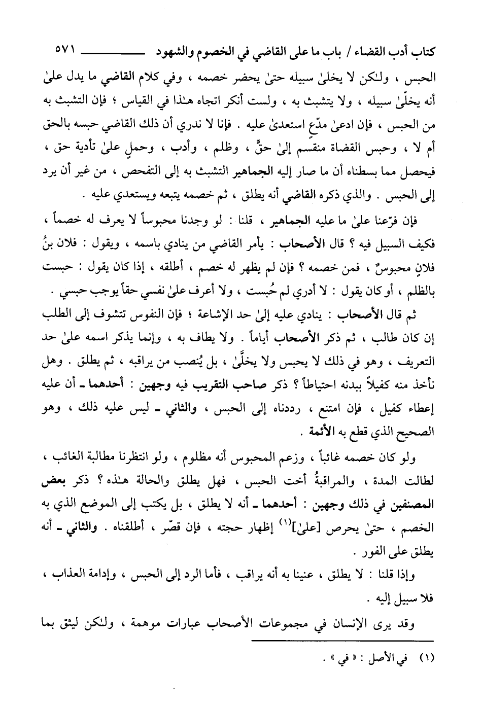 الحبس، ولكن لا يخلى سبيله حتى يحضر خصمه، وفي كلام القاضي ما يدل على أنه يخلّى سبيله، ولا يتشبث به، ولست أنكر اتجاه هذا في القياس؛ فإن التشبث به من الحبس، فإن ادعى مدّعٍ استعدى عليه. فإنا لا ندري أن ذلك القاضي حبسه بالحق أم لا، وحبس القضاة منقسم إلى حقٍّ، وظلم، وأدب، وحملٍ على تأدية حق، فيحصل مما بسطناه أن ما صار إليه الجماهير التشبث به إلى التفحص، من غير أن يرد إلى الحبس. والذي ذكره القاضي أنه يطلق، ثم خصمه يتبعه ويستعدي عليه.