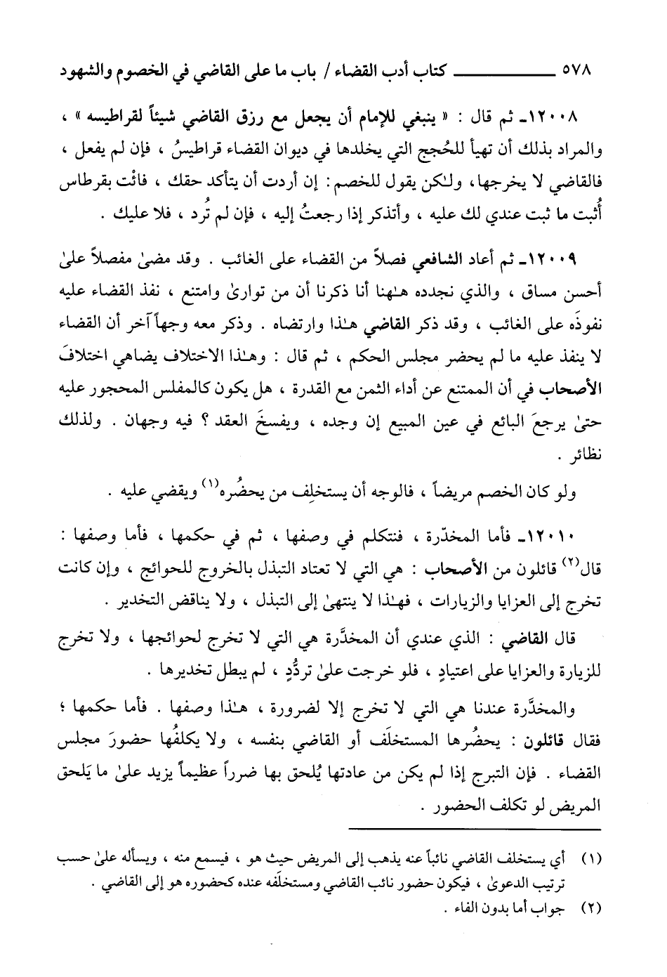 (1) أي يستخلف القاضىِ نائباً عه يذهب إلى المريض حيث هو، فيسمع منه، ويسأله على حسب ترتيب الدعوى، فيكون حضور نائب القاضي ومستخلَفه عنده كحضوره هو إلى القاضي.