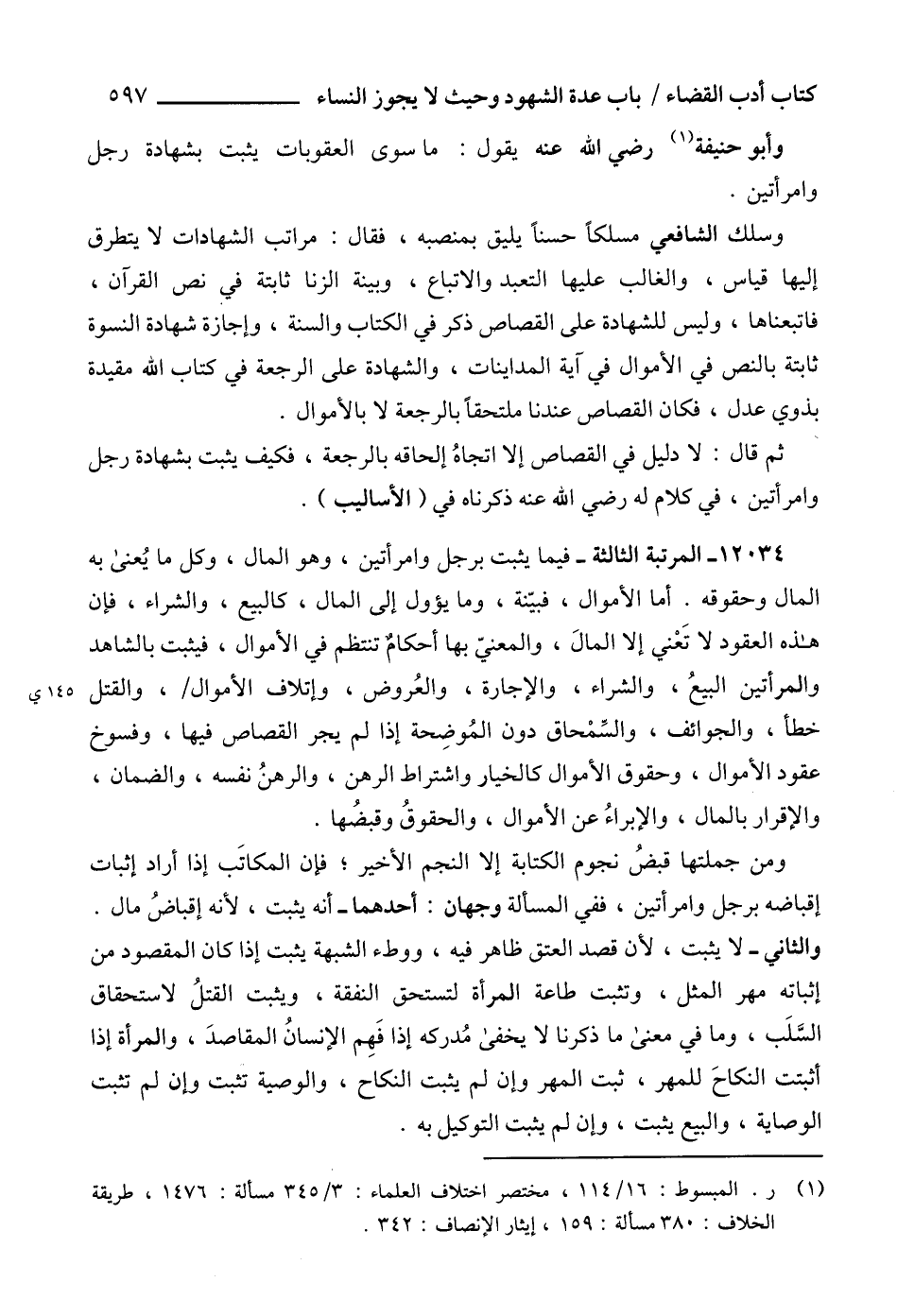 12034 - المرتبة الثالثة - فيما يثبت برجل وامرأتين، وهو المال، وكل ما يُعنى به المال وحقوقه. أما الأموال، فبيّنة، وما يؤول إلى المال، كالبيع، والشراء، فإن هذه العقود لا تَعْني إلا المالَ، والمعنيّ بها أحكامٌ تنتظم في الأموال، فيثبت بالشاهد والمرأتين البيعُ، والشراء، والإجارة، والعُروض، وإتلاف الأموال، والقتل خطأ، والجوائف، والسِّمْحاق دون المُوضِحة إذا لم يجر القصاص فيها، وفسوخ عقود الأموال، وحقوق الأموال كالخيار واشتراط الرهن، والرهنُ نفسه، والضمان، والإقرار بالمال، والإبراءُ عن الأموال، والحقوقُ وقبضُها.