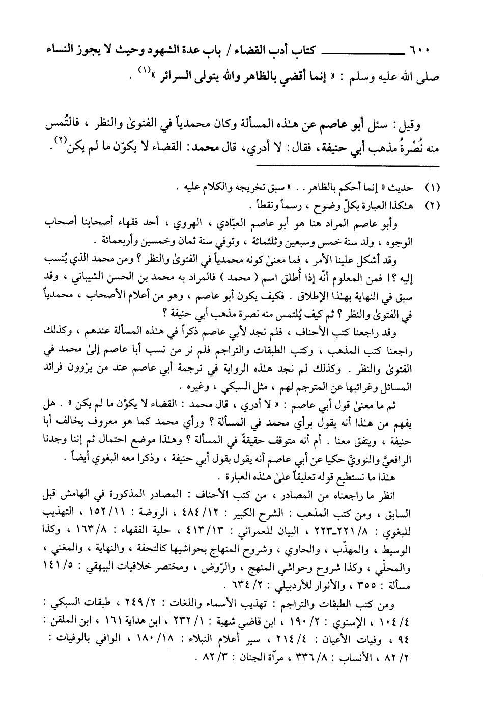 وقد راجعنا كتب الأحناف، فلم نجد لأبي عاصم ذكراً في هذه المسألة عندهم، وكذلك راجعنا كتب المذهب، وكتب الطبقات والتراجم فلم نر من نسب أبا عاصم إلى محمد في الفتوى والنظر. وكذلك لم نجد هذه الرواية في ترجمة أبي عاصم عند من يرْوون فرائد المسائل وغرائبها عن المترجم لهم، مثل السبكي، وغيره.