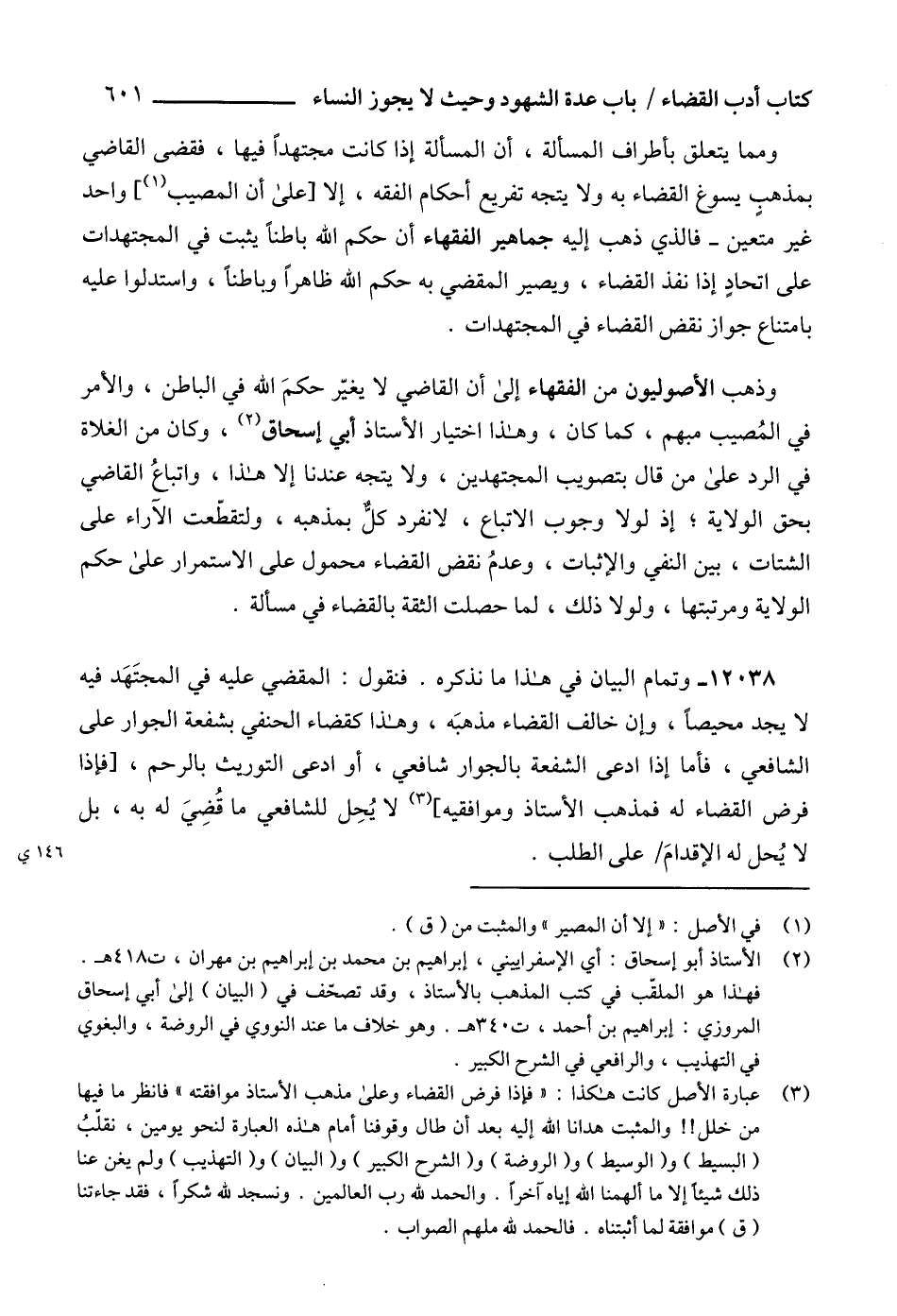 (3) عبارة الأصل كانت هكذا: " فإذا فرض القضاء وعلى مذهب الأستاذ موافقته " فانظر ما فيها من خلل!! والمثبت هدانا الله إليه بعد أن طال وقوفنا أمام هذه العبارة لنحو يومين، نقلّبُ (البسيط) و (الوسيط) و (الروضة) و (الشرح الكبير) و (البيان) و (التهذيب) ولم يغن عنا ذلك شيئاً إلا ما ألهمنا الله إياه آخراً. والحمد لله رب العالمين. ونسجد لله شكراً، فقد جاءتنا (ق) موافقة لما أثبتناه. فالحمد لله ملهم الصواب.