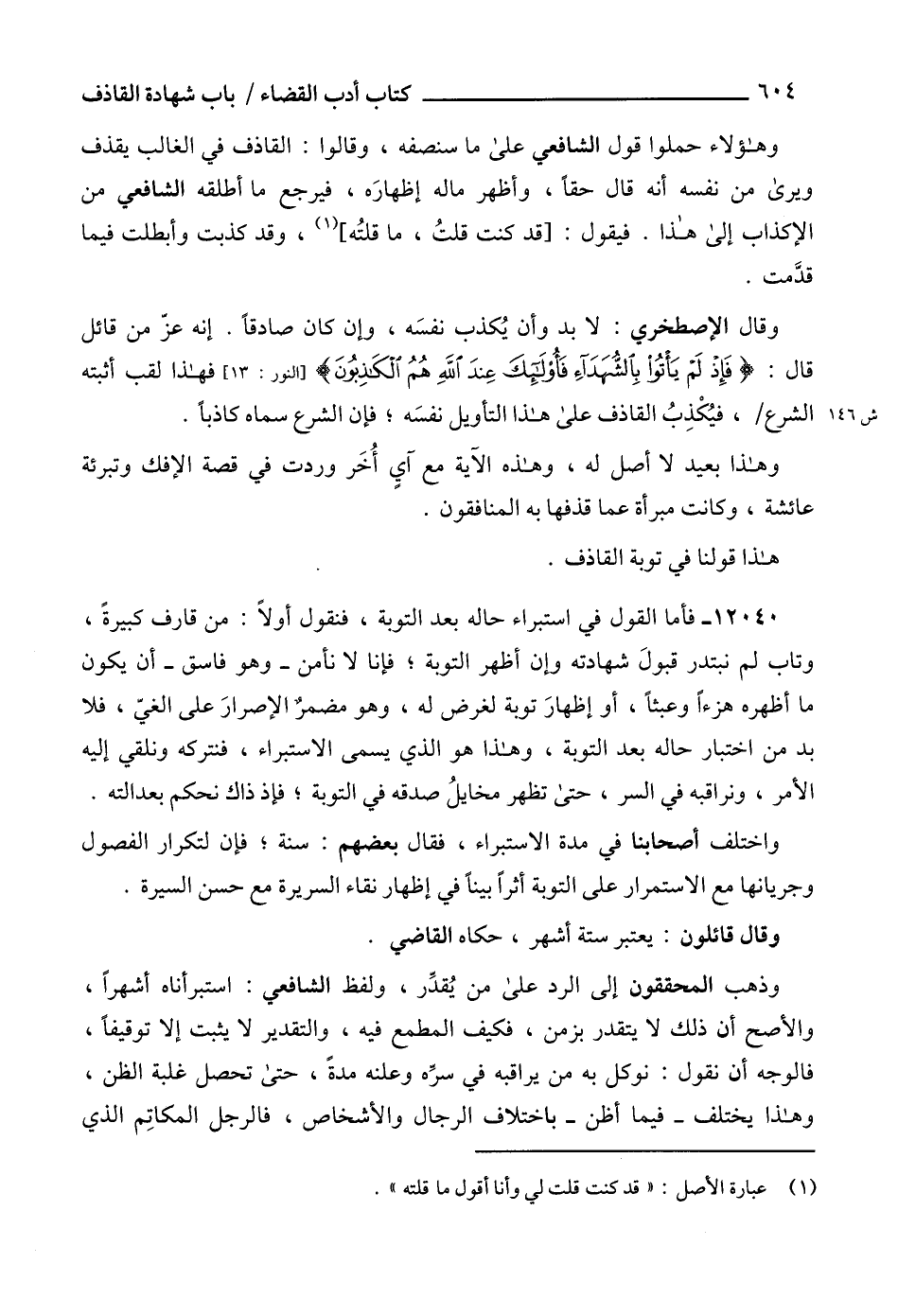 وقال الإصطخري: لا بد وأن يُكذب نفسَه، وإن كان صادقاً. إنه عزّ من قائل قال: {فَإِذْ لَمْ يَأْتُوا بِالشُّهَدَاءِ فَأُولَئِكَ عِنْدَ اللَّهِ هُمُ الْكَاذِبُونَ} [النور: 13]، فهذا لقب أثبته الشرع، فيُكْذِبُ القاذف على هذا التأويل نفسَه؛ فإن الشرع سماه كاذباً.