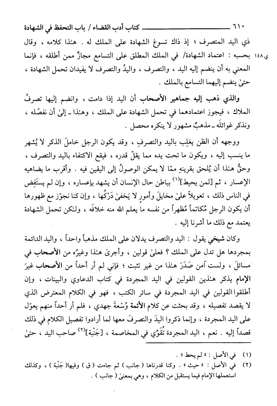 ذي اليد المتصرف؛ إذ ذاك تسوغ الشهادة على الملك له. هذا كلامه، وقال بحسبه: اعتماد الشهادة في الملك المطلق على التسامع مجازٌ ممن أطلقه، فإنما المعني به أن ينضم إليه اليد، والتصرف، واليدُ والتصرف لا يفيدان تحمل الشهادة، حتى ينضم إليهما التسامع بالملك.