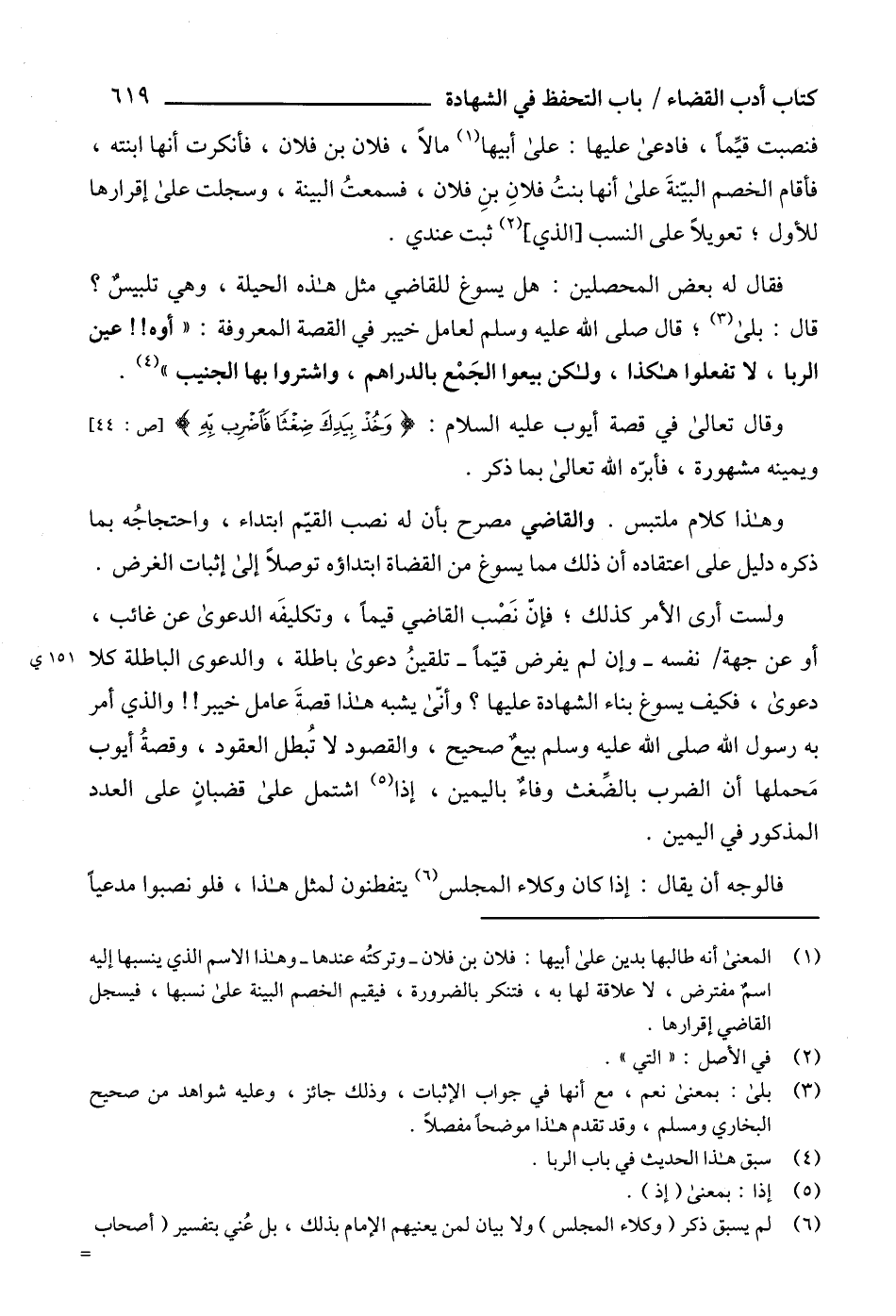 ولست أرى الأمر كذلك؛ فإنّ نَصْب القاضي قيماً، وتكليفَه الدعوى عن غائب، أو عن جهة نفسه -وإن لم يفرض قيّماً- تلقينُ دعوى باطلة، والدعوى الباطلة كلا دعوى، فكيف يسوغ بناء الشهادة عليها؟ وأنّى يشبه هذا قصةَ عامل خيبر!! والذي أمر به رسول الله صلى الله عليه وسلم بيعٌ صحيح، والقصود لا تُبطل العقود، وقصةُ أيوب مَحملها أن الضرب بالضِّغث وفاءٌ باليمين، إذا (5) اشتمل على قضبانٍ على العدد المذكور في اليمين.