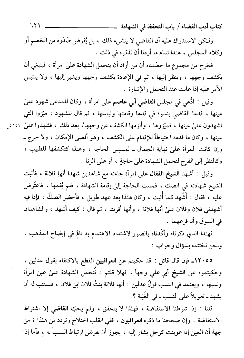 وقيل: أشهد الشيخ القفال على امرأة جاءته مع شاهدين شهدا أنها فلانة، فأثبت الشيخ شهاته في الصك، فمست الحاجة إلى إقامة الشهادة، فلم يُقمها، فاعتُرض عليه، فقال: أَشْهد كما أُثبت، وكان هذا بعد عهد طويل، فأحضر الصكَّ، فإذا فيه أشهدني فلان وفلان على أنها فلانة، وأنها أقرت، ثم قال: كيف أشهد، والشاهدان في السوق وأنا فرعهما.