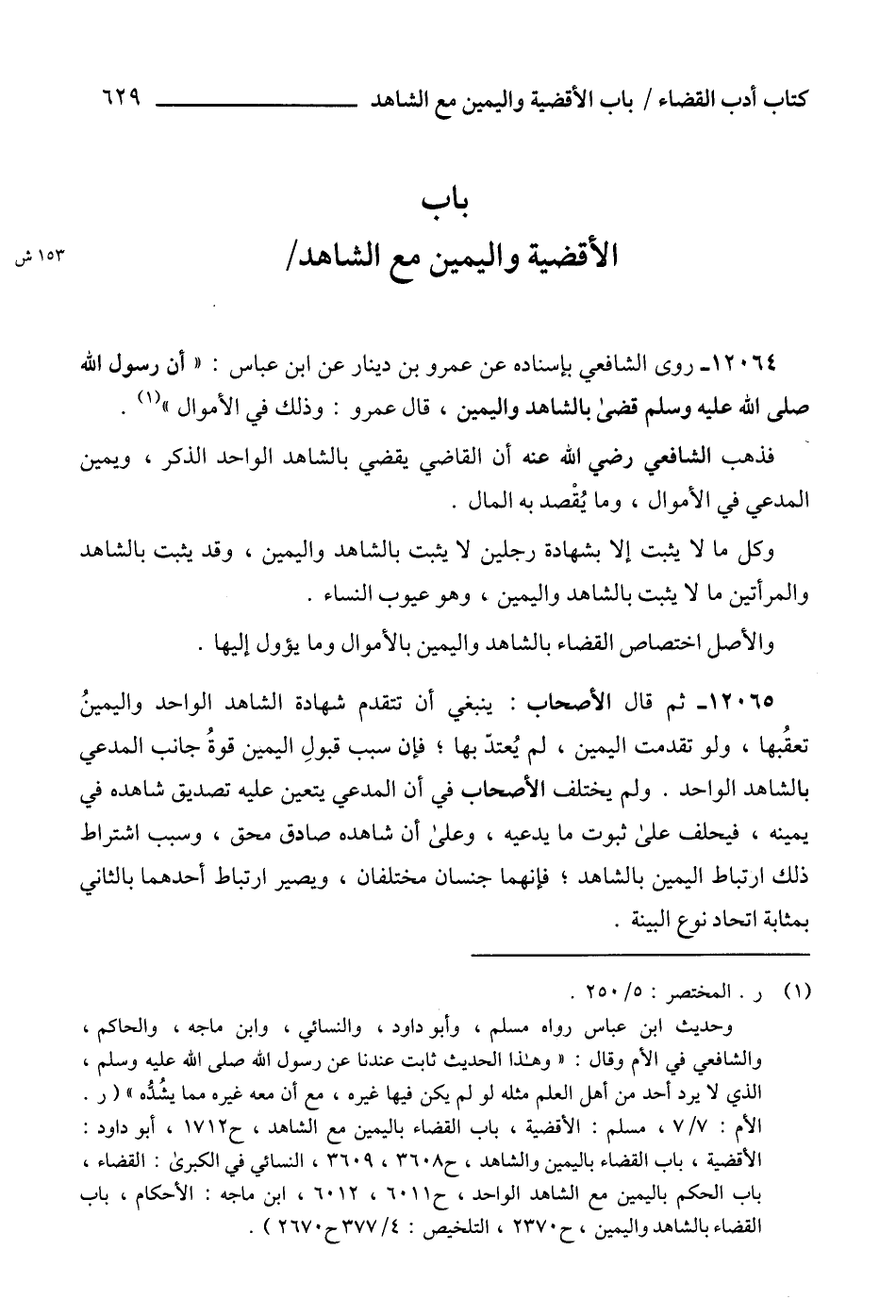 وحديث ابن عباس رواه مسلم، وأبو داود، والنسائي، وابن ماجه، والحاكم، والشافعي في الأم وقال: " وهذا الحديث ثابت عندنا عن رسول اله صلى الله عليه وسلم، الذي لا يرد أحد من أهل العلم مثله لو لم يكن فيها غيره، مع أن معه غيره مما يشُدُّه " (ر. الأم: 7/ 7، مسلم: الأقضية، باب القضاء باليمين مع الشاهد، ح 1712، أبو داود: الأقضية، باب القضاء باليمين والشاهد، ح3608، 3609، النسائي في الكبرى: القضاء، باب الحكم باليمين مع الشاهد الواحد، ح6011، 6012، ابن ماجه: الأحكام، باب القضاء بالشاهد واليمين، ح2370، التلخيص: 4/ 377 ح2670).