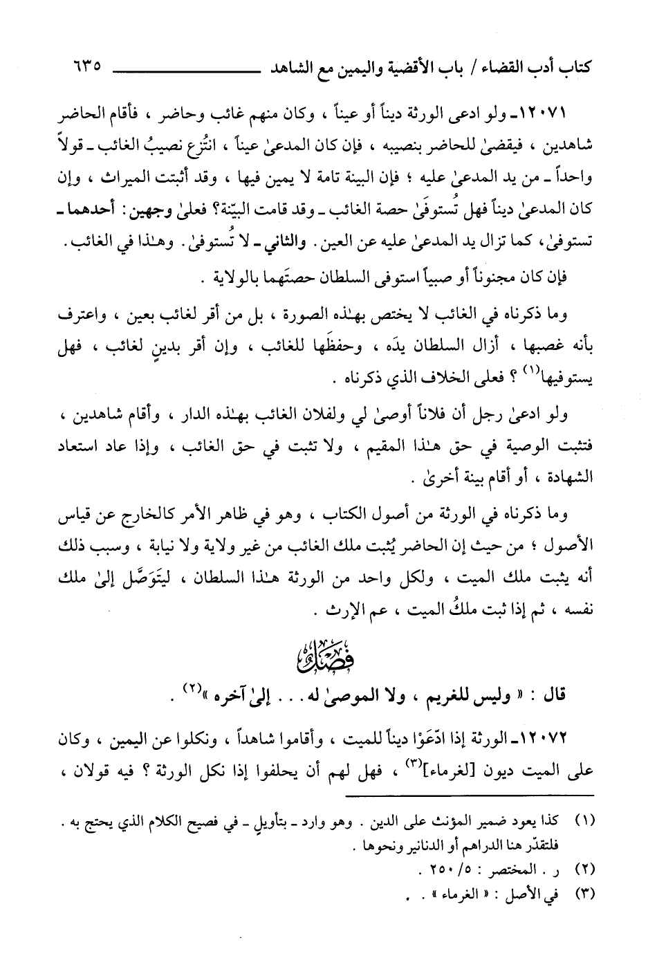 12072 - الورثة إذا ادّعَوْا ديناً للميت، وأقاموا شاهداًً، ونكلوا عن اليمين، وكان على الميت ديون [لغرماء] (3)، فهل لهم أن يحلفوا إذا نكل الورثة؟ فيه قولان،