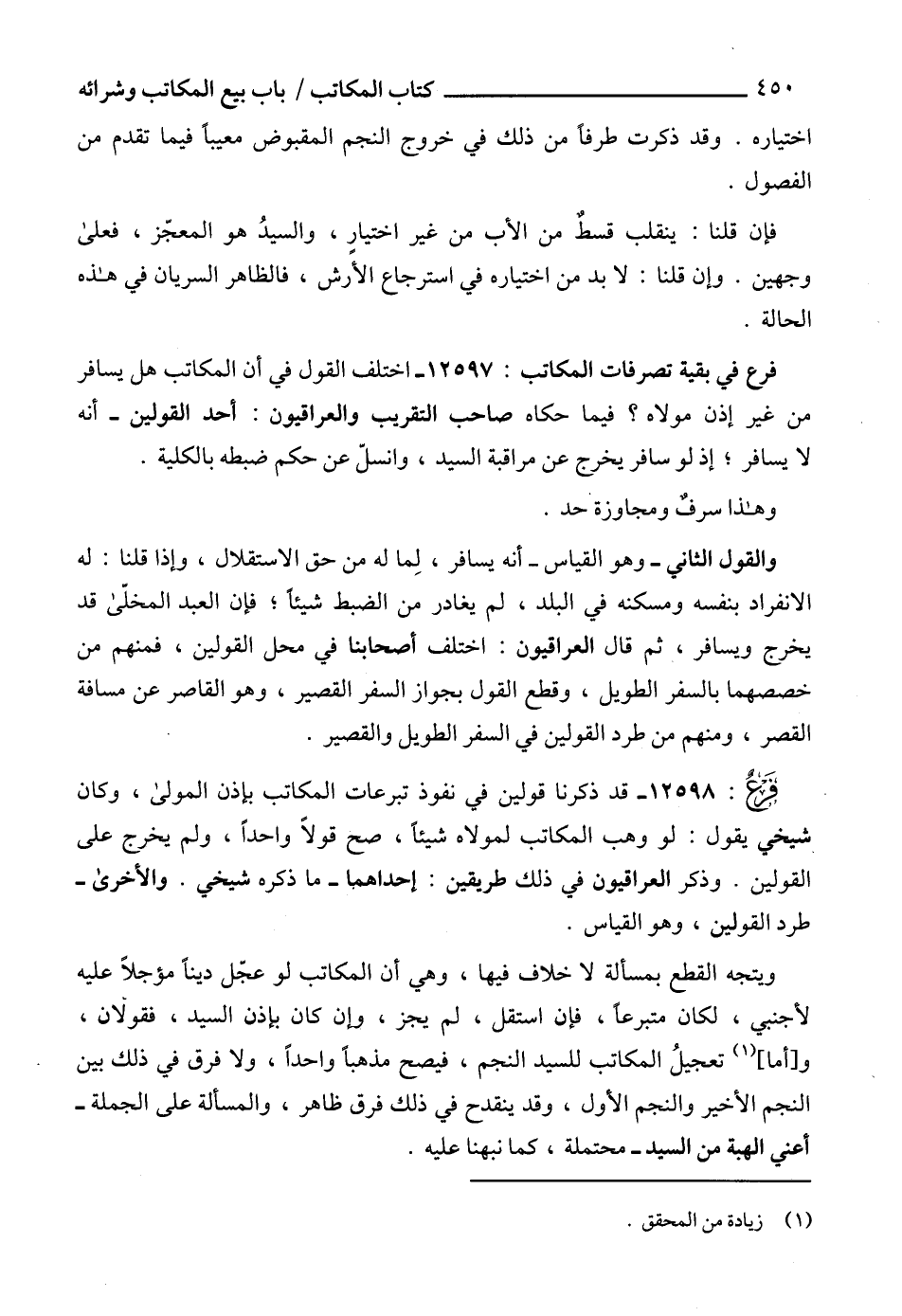 12597 - اختلف القول في أن المكاتب هل يسافر من غير إذن مولاه؟ فيما حكاه صاحب التقريب والعراقيون: أحد القولين - أنه لا يسافر؛ إذ لو سافر يخرج عن مراقبة السيد، وانسلّ عن حكم ضبطه بالكلية.