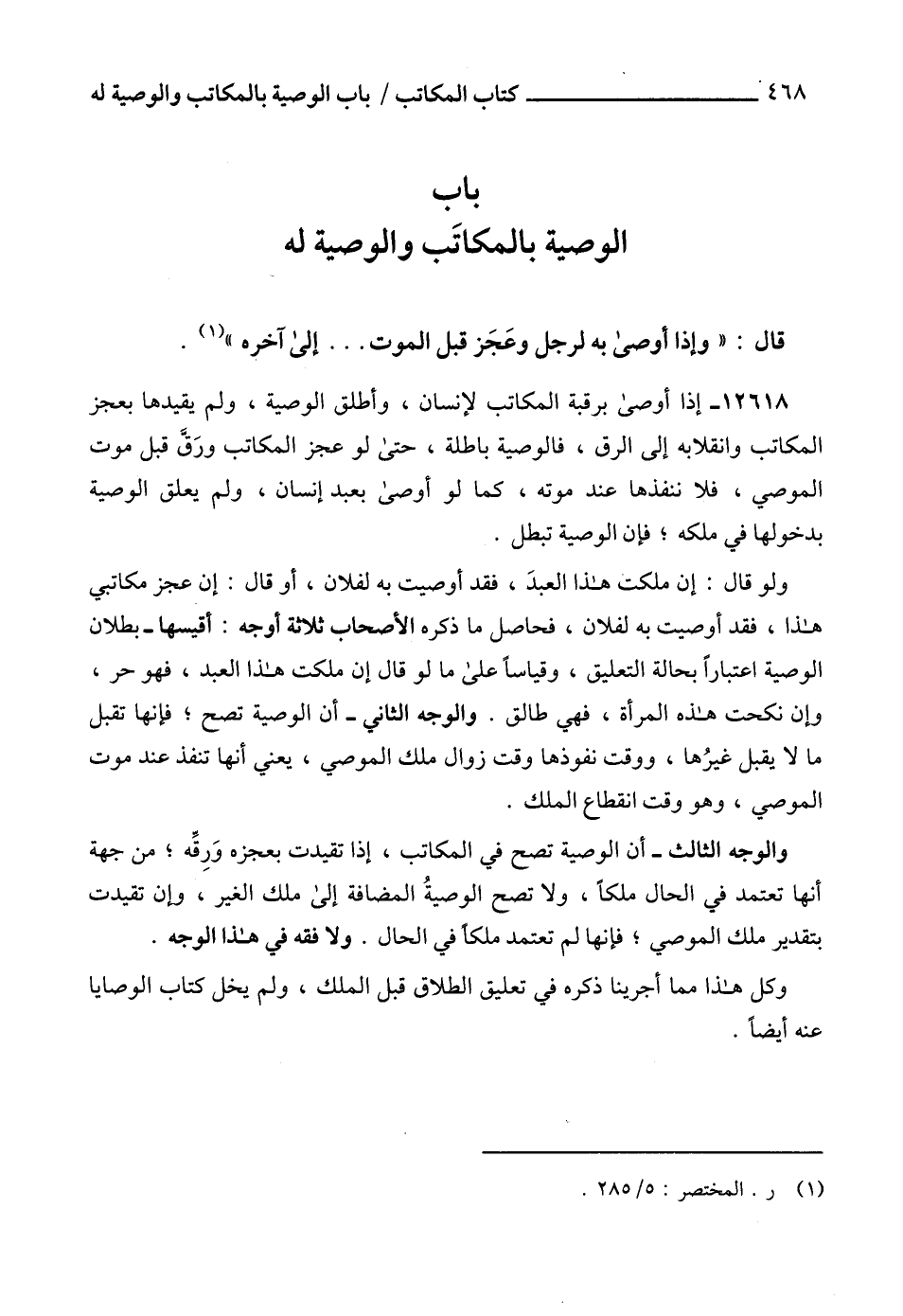 12618 - إذا أوصى برقبة المكاتب لإنسان، وأطلق الوصية، ولم يقيدها بعجز المكاتب وانقلابه إلى الرق، فالوصية باطلة، حتى لو عجز المكاتب ورَقَّ قبل موت الموصي، فلا ننفذها عند موته، كما لو أوصى بعبد إنسان، ولم يعلق الوصية بدخولها في ملكه؛ فإن الوصية تبطل.