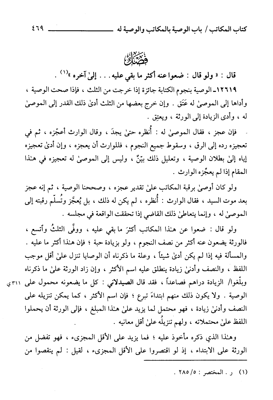 12619 - الوصية بنجوم الكتابة جائزة إذا خرجت من الثلث، فإذا صحت الوصية، وأداها إلى الموصى له عَتَق. وإن خرج بعضها من الثلث أدى ذلك القدر إلى الموصى له، وأدى الزيادة إلى الورثة، ويعتِق.