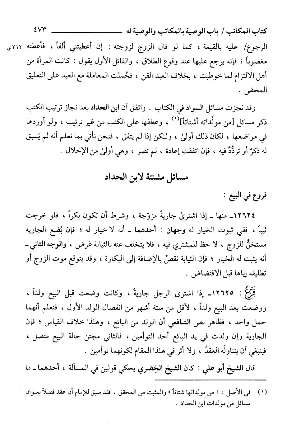 وقد نجزت مسائل السواد في الكتاب. واتفق أن ابن الحداد بعد نجاز ترتيب الكتب ذكر مسائل [من مولَّداته أشتاتاً] (1)، وعطفها على الكتب من غير ترتيب، ولو أوردها في مواضعها، لكان ذلك أولى، ولكن إذا لم يتفق، فنحن نأتي بما نعلم أنه لم يَسبق له ذكرٌ أو تردُّدٌ فيه، فإن اتفقت إعادة، لم تضر، وهي أولى من الإخلال.