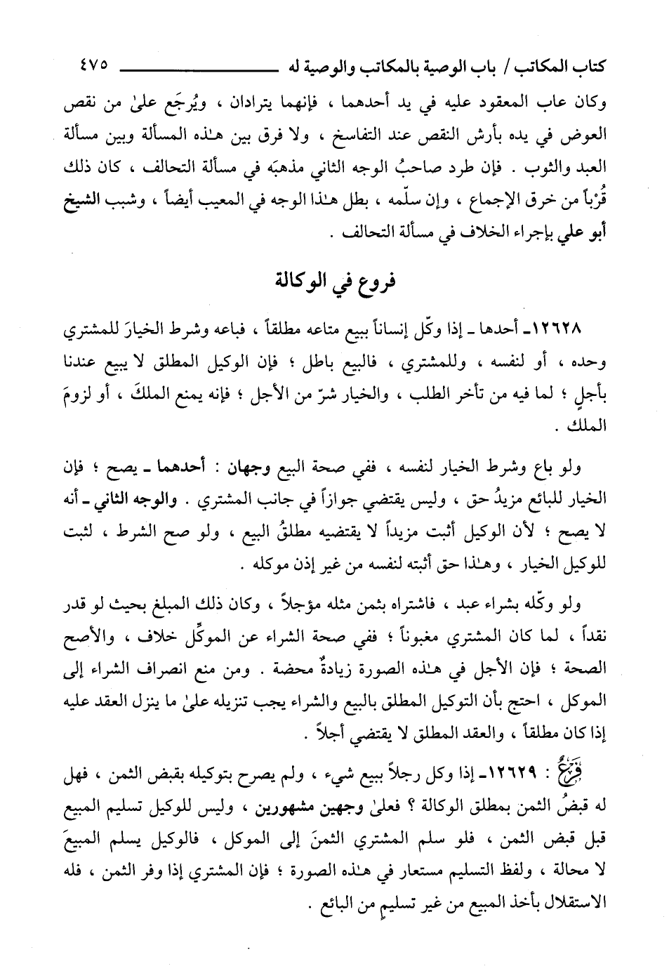 12628 - أحدها - إذا وكّل إنساناً ببيع متاعه مطلقاً، فباعه وشرط الخيارَ للمشتري وحده، أو لنفسه، وللمشتري، فالبيع باطل؛ فإن الوكيل المطلق لا يبيع عندنا بأجلٍ؛ لما فيه من تأخر الطلب، والخيار شرّ من الأجل؛ فإنه يمنع الملكَ، أو لزومَ الملك.