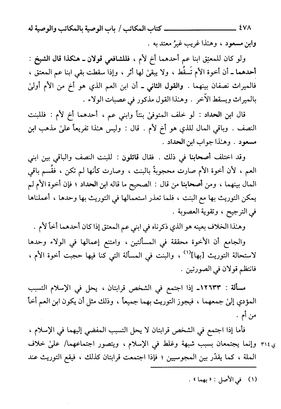 وقد اختلف أصحابنا في ذلك. فقال قائلون: للبنت النصف والباقي بين ابني العم، لأن أخوة الأم صارت محجوبةً بالبنت، وصارت كأنها لم تكن، فقُسم باقي المال بينهما، ومن أصحابنا من قال: الصحيح ما قاله ابن الحداد؛ فإن أخوة الأم لم يمكن التوريث بها مع البنت، فلما تعذر استعمالها في التوريث بها وحدها، أعملناها في الترجيح، وتقوية العصوبة.