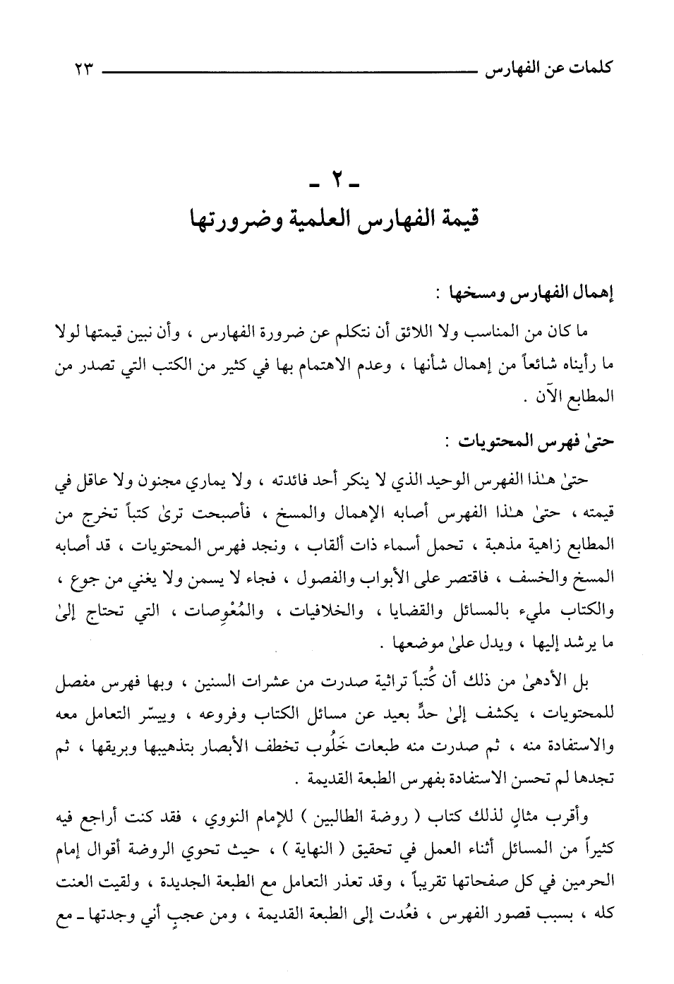حتى هذا الفهرس الوحيد الذي لا ينكر أحد فائدته، ولا يماري مجنون ولا عاقل في قيمته، حتى هذا الفهرس أصابه الإهمال والمسخ، فأصبحت ترى كتباً تخرج من المطابع زاهية مذهبة، تحمل أسماء ذات ألقاب، ونجد فهرس المحتويات، قد أصابه المسخ والخسف، فاقتصر على الأبواب والفصول، فجاء لا يسمن ولا يغني من جوع، والكتاب مليء بالمسائل والقضايا، والخلافيات، والمُعْوِصات، التي تحتاج إلى ما يرشد إليها، ويدل على موضعها.