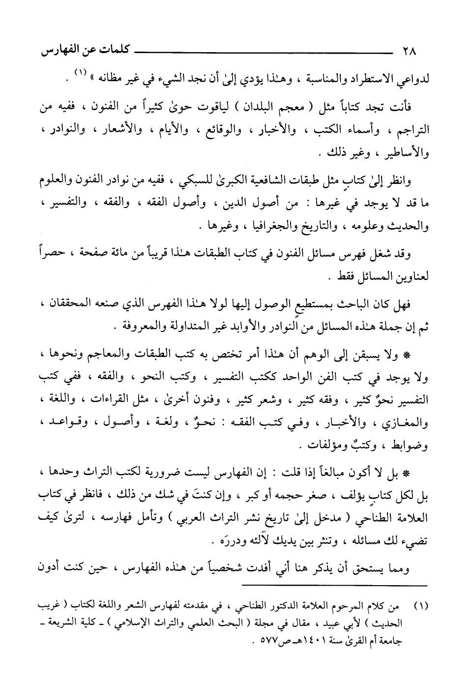 * بل لا أكون مبالغاً إذا قلت: إن الفهارس ليست ضرورية لكتب التراث وحدها، بل لكل كتابٍ يؤلف، صغر حجمه أو كبر، وإن كنتَ في شك من ذلك، فانظر في كتاب العلامة الطناحي (مدخل إلى تاريخ نشر التراث العربي) وتأمل فهارسه، لترى كيف تضيء لك مسائله، وتنثر لين يديك لآلئه ودررَه.