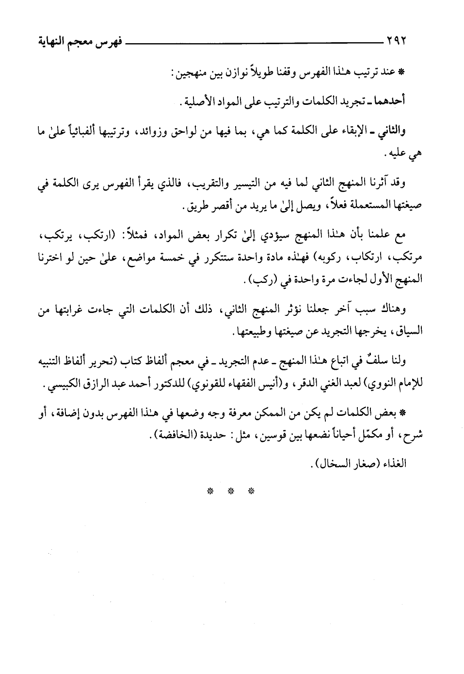 ولنا سلفٌ في اتباع هذا المنهج -عدم التجريد- في معجم ألفاظ كتاب (تحرير ألفاظ التنبيه للإمام النووي) لعبد الغني الدقر، و (أنيس الفقهاء للقونوي) للدكتور أحمد عبد الرازق الكبيسي.