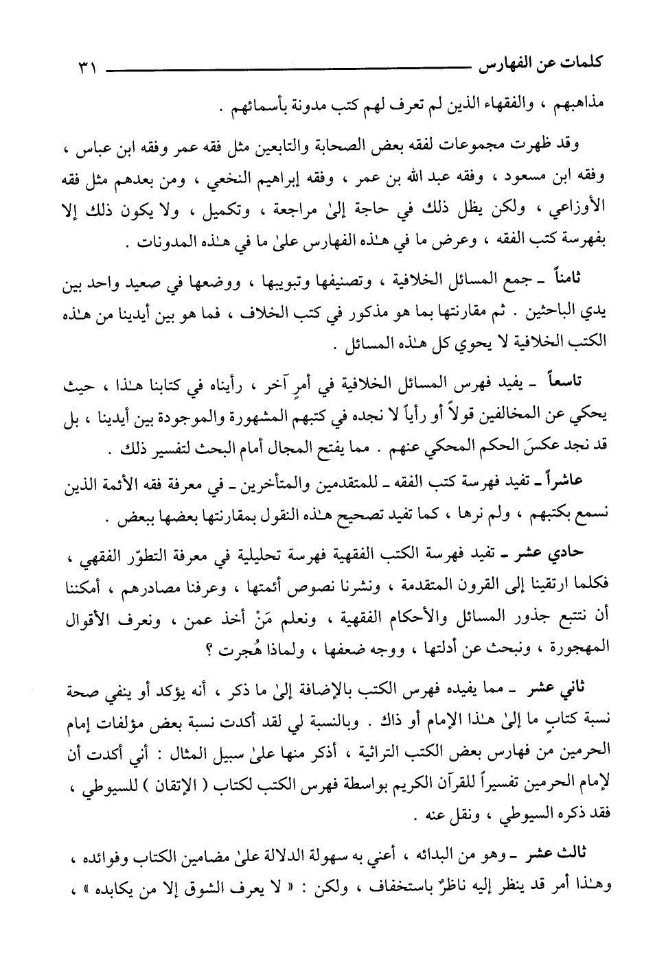 ثاني عشر - مما يفيده فهرس الكتب بالإضافة إلى ما ذكر، أنه يؤكد أو ينفي صحة نسبة كتابٍ ما إلى هذا الإمام أو ذاك. وبالنسبة لي لقد أكدت نسبة بعض مؤلفات إمام الحرمين من فهارس بعض الكتب التراثية، أذكر منها على سبيل المثال: أني أكدت أن لإمام الحرمين تفسيراً للقرآن الكريم بواسطة فهرس الكتب لكتاب (الإتقان) للسيوطي، فقد ذكره السيوطي، ونقل عنه.