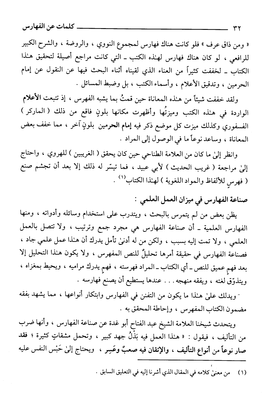 ويتحدث شيخنا العلامة الشيخ عبد الفتاح أبو غدة عن صناعة الفهارس، وأنها ضرب من التأليف، فيقول: "هذا العمل فيه بَذْلُ جهد كبير، وتحمل مشقاتٍ كثيرة؛ فقد صار نوعاً من أنواع التأليف، والإتقان فيه صعبٌ وعَسِر، ويحتاج إلى حَبْس النفس عليه