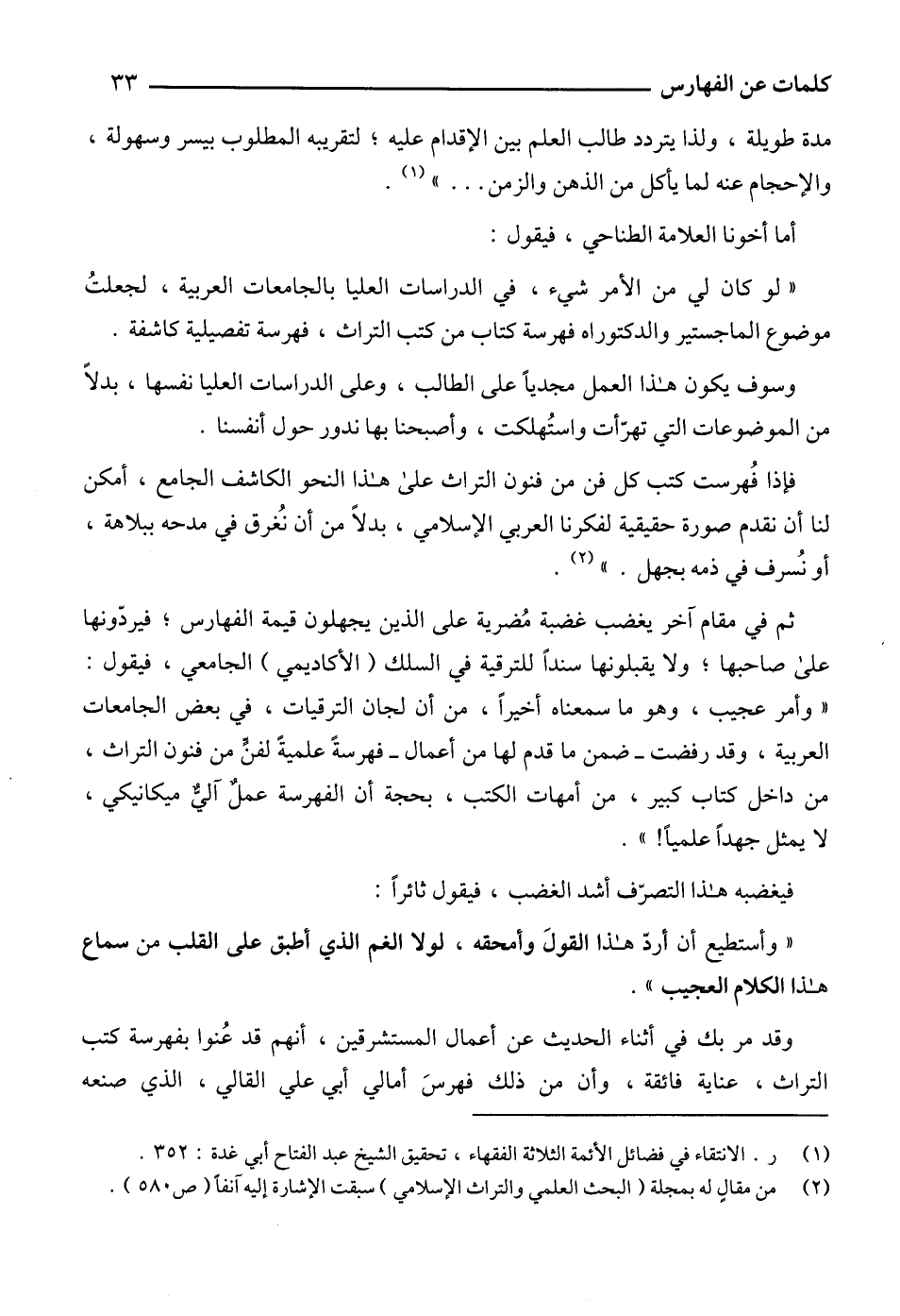 ثم في مقام آخر يغضب غضبة مُضرية على الذين يجهلون قيمة الفهارس؛ فيردّونها على صاحبها؛ ولا يقبلونها سنداً للترقية في السلك (الأكاديمي) الجامعي، فيقول: "وأمر عجيب، وهو ما سمعناه أخيراً، من أن لجان الترقيات، في بعض الجامعات العربية، وقد رفضت -ضمن ما قدم لها من أعمال- فهرسةً علميةً لفنٍّ من فنون التراث، من داخل كتاب كبير، من أمهات الكتب، بحجة أن الفهرسة عملٌ آليٌّ ميكانيكي، لا يمثل جهداً علمياً! ".