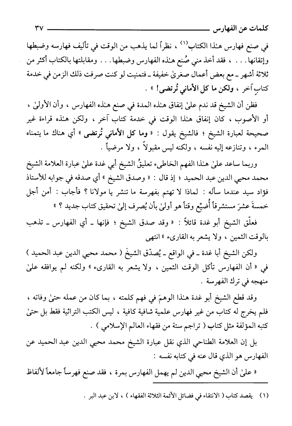 فظن أن الشيخ قد ندم على إنفاق هذه المدة في صنع هذه الفهارس، وأن الأولى، أو الأصوب، كان إنفاق هذا الوقت في خدمة كتاب آخر، ولكن هذه قراءة غير صحيحة لعبارة الشيخ؛ فالشيخ يقول: "وما كل الأماني تُرتضى" أي هناك ما يتمناه المرء، وتنازعه إليه نفسه، ولكنه ليس مقبولاً، ولا مرضياً.