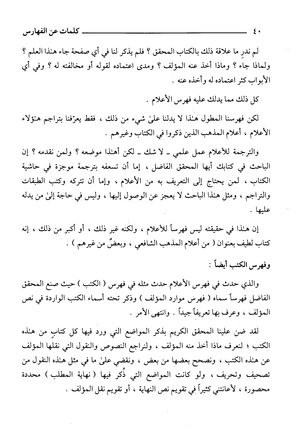 لقد ضن علينا المحقق الكريم بذكر المواضع التي ورد فيها كل كتابٍ من هذه الكتب؛ لنعرف ماذا أخذ منه المؤلف، ولنراجع النصوص والنقول التي نقلها المؤلف عن هذه الكتب، ونصحح بعضها من بعض، ونقضي على ما في مثل هذه النقول من تصحيف وتحريف، ولو كانت المواضع التي ذُكر فيها (نهاية المطلب) محددة محصورة، لأعانتني كثيراً في تقويم نص النهاية، أو تقويم نقل المؤلف.