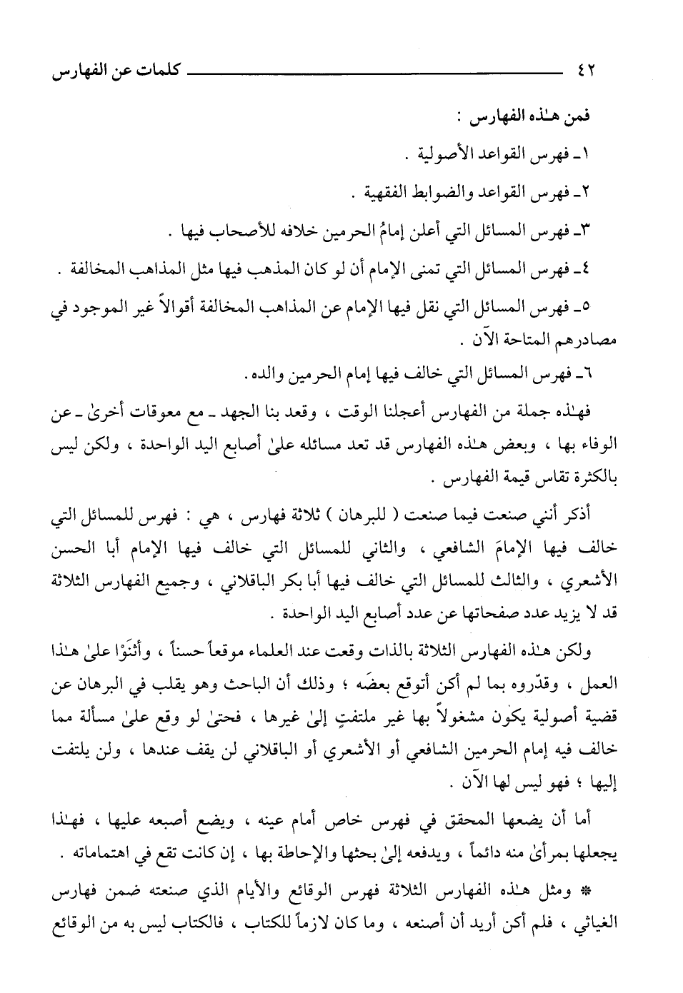 أذكر أنني صنعت فيما صنعت (للبرهان) ثلاثة فهارس، هي: فهرس للمسائل التي خالف فيها الإمامَ الشافعي، والثاني للمسائل التي خالف فيها الإمام أبا الحسن الأشعري، والثالث للمسائل التي خالف فيها أبا بكر الباقلاني، وجميع الفهارس الثلاثة قد لا يزيد عدد صفحاتها عن عدد أصابع اليد الواحدة.