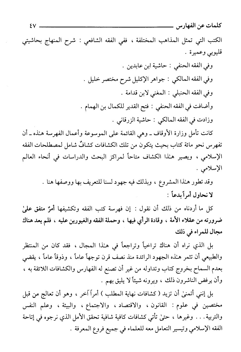 كل ما أردناه من ذلك أن نقول: إن فهرسة كتب الفقه وتكشيفها أمرٌ متفق على ضرورته من عقلاء الأمة، وقادة الرأي فيها، وحملة الفقه والغيورين عليه، فلم يعد هناك مجال للمراء في ذلك