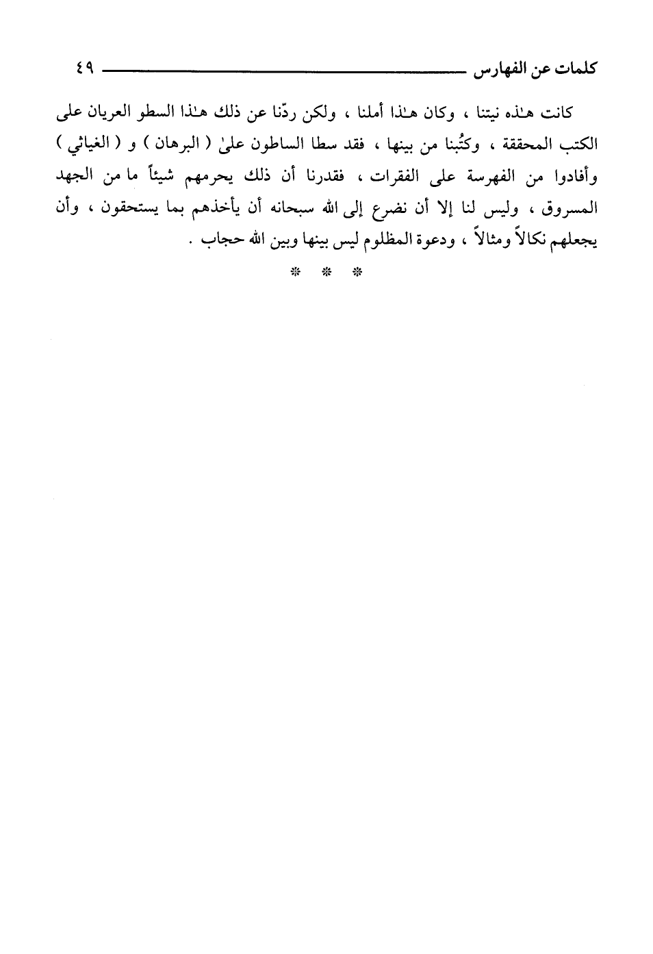 كانت هذه نيتنا، وكان هذا أملنا، ولكن ردّنا عن ذلك هذا السطو العريان على الكتب المحققة، وكتُبنا من بينها، فقد سطا الساطون على (البرهان) و (الغياثي) وأفادوا من الفهرسة على الفقرات، فقدرنا أن ذلك يحرمهم شيئاً ما من الجهد المسروق، وليس لنا إلا أن نضرع إلى الله سبحانه أن يأخذهم بما يستحقون، وأن يجعلهم نكالاً ومثالاً، ودعوة المظلوم ليس بينها وبين الله حجاب.
