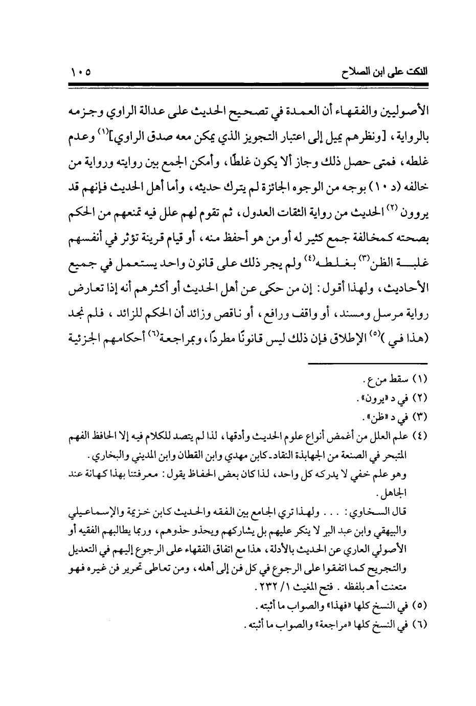 الْأُصُولِيِّينَ وَالْفُقَهَاء أَن الْعُمْدَة فِي تَصْحِيح الحَدِيث على عَدَالَة الرَّاوِي وجزمه بالرواية [ونظرهم يمِيل إِلَى اعْتِبَار التجويز الَّذِي يُمكن مَعَه صدق الرَّاوِي] وَعدم غلطه فَمَتَى حصل ذَلِك وَجَاز أَلا يكون غَلطا وَأمكن الْجمع بَين رِوَايَته وَرِوَايَة من خَالفه (د 10) يُوَجه من الْوُجُوه الْجَائِزَة لم يتْرك حَدِيثه وَأما أهل الحَدِيث فَإِنَّهُم قد يروون الحَدِيث من رِوَايَة الثِّقَات الْعُدُول ثمَّ تقوم لَهُم علل فِيهِ تمنعهم من الحكم بِصِحَّتِهِ كمخالفة جمع كثير لَهُ أَو من هُوَ أحفظ مِنْهُ أَو قيام قرينَة تُؤثر فِي أنفسهم غَلَبَة الظَّن بغلطة وَلم يجر ذَلِك على قانون وَاحِد يسْتَعْمل فِي جَمِيع الْأَحَادِيث وَلِهَذَا أَقُول إِن من حكى عَن أهل الحَدِيث أَو أَكْثَرهم أَنه إِذا تعَارض رِوَايَة مُرْسل ومسند أَو وَاقِف وَرَافِع أَو نَاقص وزائد أَن الحكم للزائد فَلم نجد (هَذَا فِي) الْإِطْلَاق فَإِن ذَلِك لَيْسَ قانونا مطردا وبمراجعة أحكامهم الْجُزْئِيَّة