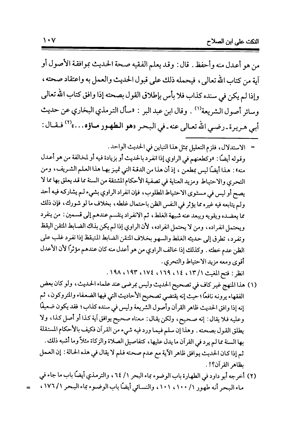 من هُوَ أعدل مِنْهُ وأحفظ قَالَ وَقد يعلم الْفَقِيه صِحَة الحَدِيث بموافقة الْأُصُول أَو آيَة من كتاب الله تَعَالَى فيحمله ذَلِك على قبُول الحَدِيث وَالْعَمَل بِهِ واعتقاد صِحَّته وَإِذا لم يكن فِي سَنَده كَذَّاب فَلَا بَأْس بِإِطْلَاق القَوْل بِصِحَّتِهِ إِذا وَافق كتاب الله تَعَالَى وَسَائِر أصُول الشَّرِيعَة وَقَالَ ابْن عبد الْبر سَأَلَ التِّرْمِذِيّ البُخَارِيّ عَن حَدِيث أبي هُرَيْرَة - رَضِي الله تَعَالَى عَنهُ - فِي الْبَحْر هُوَ الطّهُور مَاؤُهُ فَقَالَ