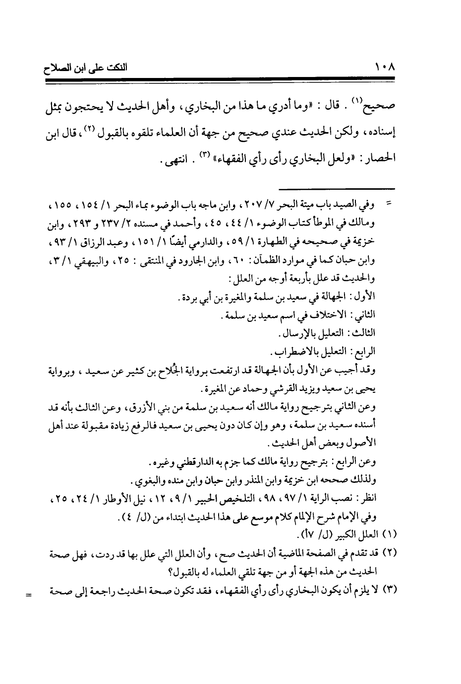 صَحِيح قَالَ وَمَا أَدْرِي مَا هَذَا من البُخَارِيّ وَأهل الحَدِيث لَا يحتجون بِمثل إِسْنَاده وَلَكِن الحَدِيث عِنْدِي صَحِيح من جِهَة أَن الْعلمَاء تلقوهُ بِالْقبُولِ قَالَ ابْن الْحصار وَلَعَلَّ البُخَارِيّ رأى رَأْي الْفُقَهَاء انْتهى