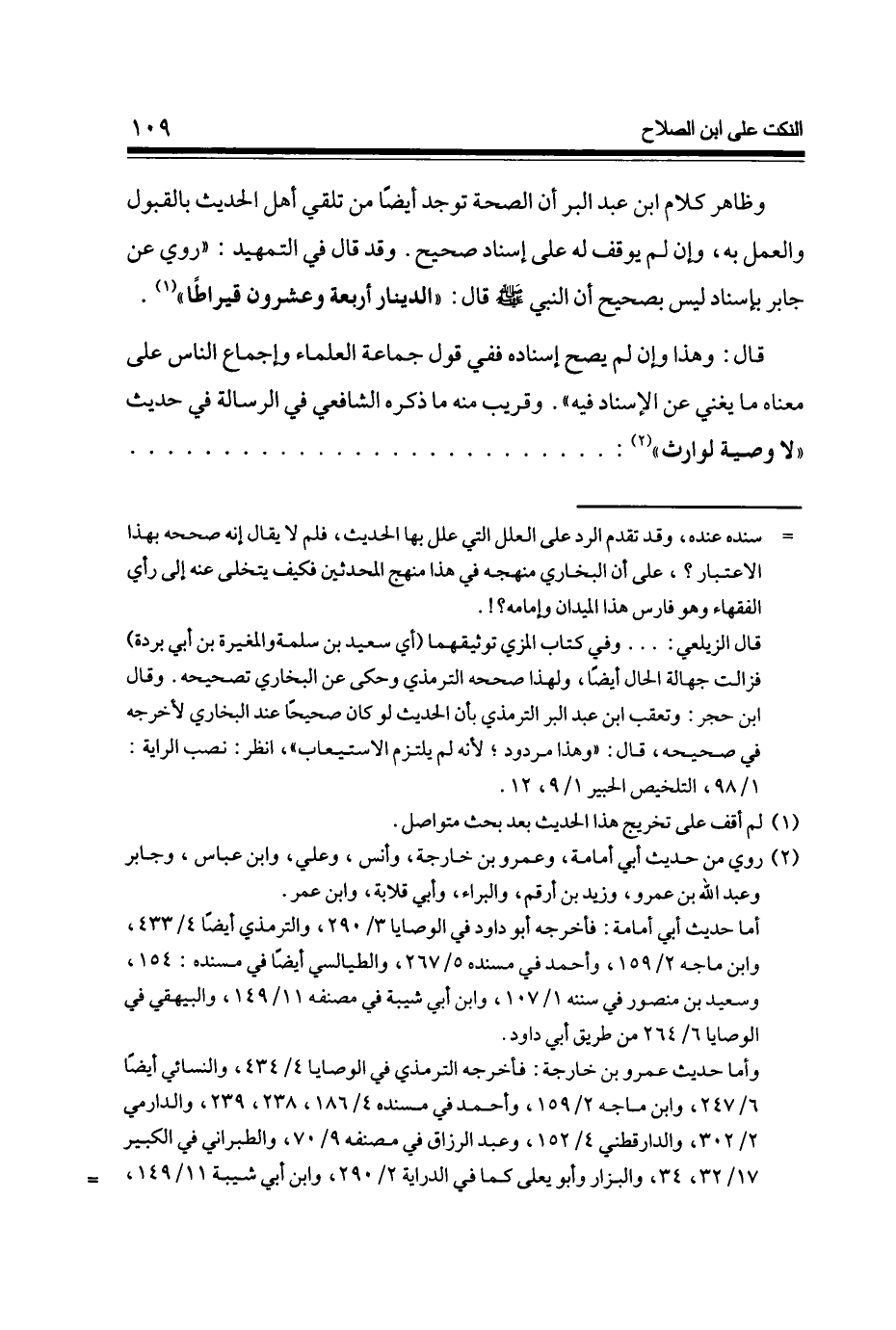 قَالَ وَهَذَا وَإِن لم يَصح إِسْنَاده فَفِي قَول جمَاعَة الْعلمَاء وَإِجْمَاع النَّاس على مَعْنَاهُ مَا يُغني عَن الْإِسْنَاد فِيهِ وَقَرِيب مِنْهُ مَا ذكره الشَّافِعِي فِي الرسَالَة فِي حَدِيث لَا وَصِيَّة لوَارث