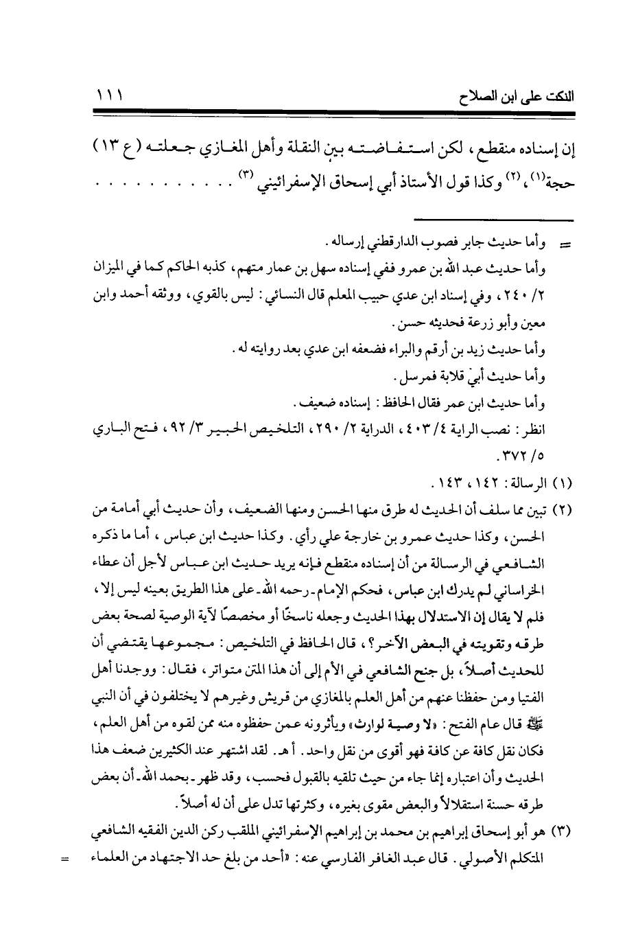 إِن إِسْنَاده مُنْقَطع لَكِن استفاضته بَين النقلَة وَأهل الْمَغَازِي جعلته (134) حجَّة وَكَذَا قَول الْأُسْتَاذ أبي إِسْحَاق الإسفرائيني