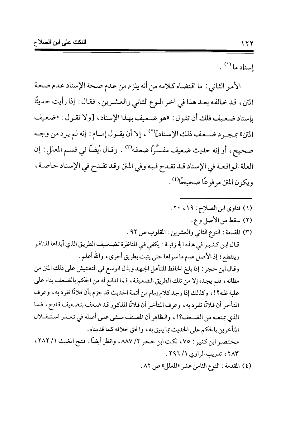 الْأَمر الثَّانِي مَا اقْتَضَاهُ كَلَامه من أَنه يلْزم من عدم صِحَة الْإِسْنَاد عدم صِحَة الْمَتْن قد خَالفه بعد هَذَا فِي آخر النَّوْع الثَّانِي وَالْعِشْرين فَقَالَ إِذا رَأَيْت حَدِيثا بِإِسْنَاد ضَعِيف فلك أَن تَقول هُوَ ضَعِيف بِهَذَا الْإِسْنَاد [وَلَا تَقول ضَعِيف الْمَتْن بِمُجَرَّد ضعف ذَلِك الْإِسْنَاد] إِلَّا أَن يَقُول إِمَام إِنَّه لم يرد من وَجه صَحِيح أَو إِنَّه حَدِيث ضَعِيف مُفَسرًا ضعفه وَقَالَ أَيْضا فِي قسم الْمُعَلل إِن الْعلَّة الْوَاقِعَة فِي الْإِسْنَاد قد تقدح فِيهِ وَفِي الْمَتْن وَقد تقدح فِي الْإِسْنَاد خَاصَّة وَيكون الْمَتْن مَرْفُوعا صَحِيحا