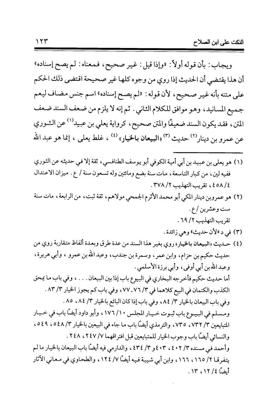 وَيُجَاب بِأَن قَوْله أَولا وَإِذا قيل غير صَحِيح فَمَعْنَاه لم يَصح إِسْنَاده أَن هَذَا يَقْتَضِي أَن الحَدِيث إِذا رُوِيَ من وُجُوه كلهَا غير صَحِيحَة أقتضى ذَلِك الحكم على مَتنه بِأَنَّهُ غير صَحِيح لِأَن قَوْله لم يَصح إِسْنَاده اسْم جنس مُضَاف ليعم جَمِيع المسانيد وَهُوَ مُوَافق للْكَلَام الثَّانِي ثمَّ إِنَّه لَا يلْزم من ضعف السَّنَد ضعف الْمَتْن فقد يكون السَّنَد ضَعِيفا والمتن صَحِيح كَرِوَايَة يعلي بن عبيد عَن الثَّوْريّ عَن عَمْرو بن دِينَار حَدِيث البيعان بِالْخِيَارِ غلط يعلى إِنَّمَا هُوَ عبد الله