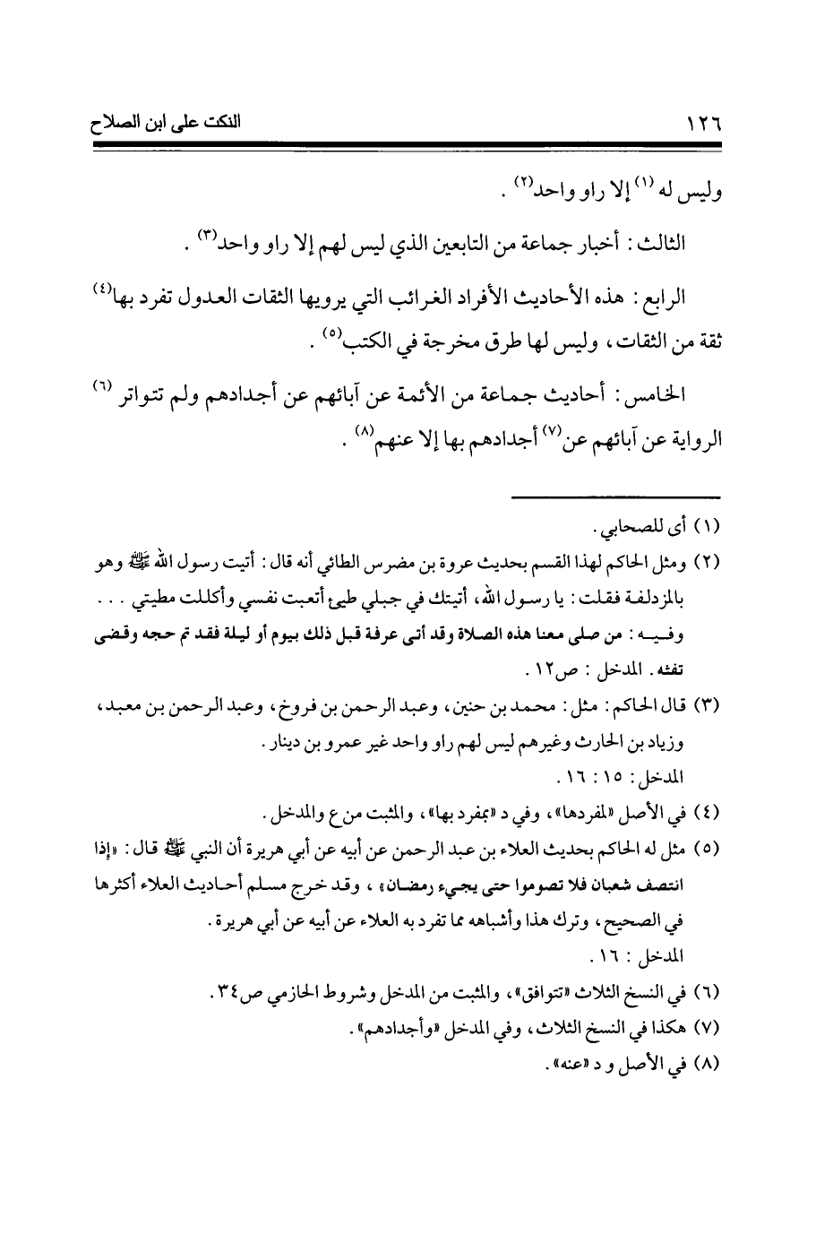 الرَّابِع هَذِه الْأَحَادِيث الْأَفْرَاد الغرائب الَّتِي يَرْوِيهَا الثِّقَات الْعُدُول تفرد بهَا ثِقَة من الثِّقَات وَلَيْسَ لَهَا طرق مخرجة فِي الْكتب